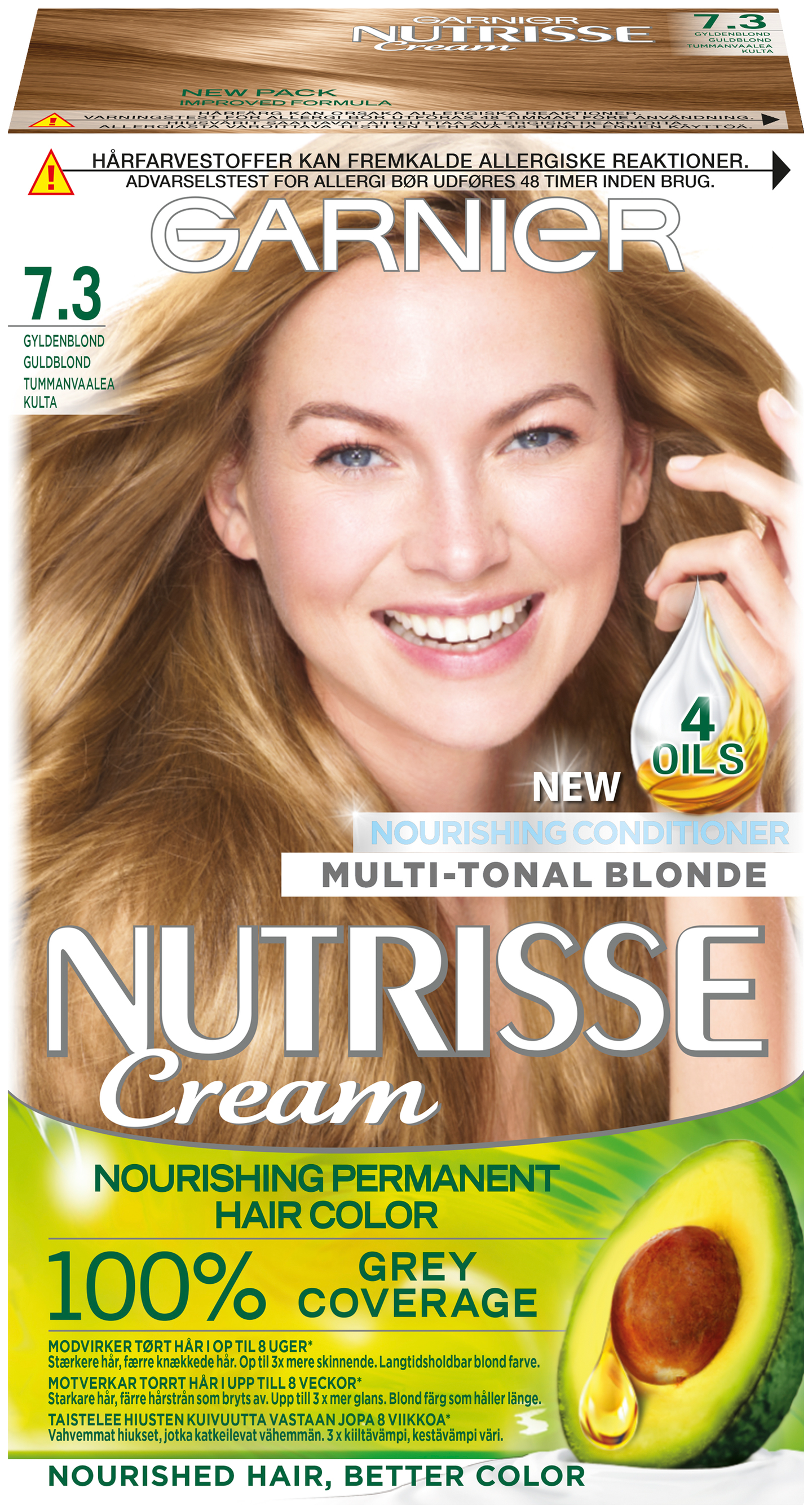Ravitut hiukset, parempi väri. Nutrisse Cream -hiusväri antaa peittävän ja luonnolliselta näyttävän lopputuloksen. Uusi hoitoaine sisältää 4 öljyä: avokado-, oliivi- ja kariteöljyä sekä uutta karpaloöljyä, jotka sulkevat hiuskuidut. Koostumus ravitsee ja vahvistaa hiuksia sekä suojaa niitä katkeilulta. Hiukset tuntuvat erittäin pehmeiltä. Väri on 3 x kiiltävämpi ja kestää 3 x kauemmin. Lue käyttöohjeet ja noudata niitä. Tätä tuotetta ei ole tarkoitettu alle 16-vuotiaiden käyttöön.
