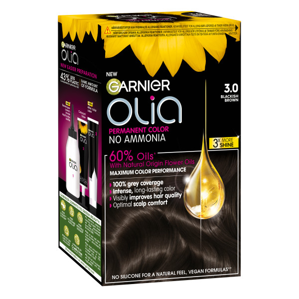 Garnier Olia 3.0 Soft Black, kestoväri ilman ammoniakkia, jonka koostumus sisältää 60% öljyjä*, antaa maksimaalisen värjäystuloksen ja tekee hiuslaadusta näkyvästi paremman. Olia 3.0 peittää harmaat hiukset jopa 100% ja on miellyttävä hiuspohjalle. 98% naisista ei havainnut näkyviä vaurioita** hiuksissaan. *Värivoiteessa **Kuluttajatutkimus, 262 naista, käytettäessä koko pakkaus.