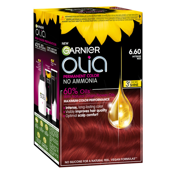 Garnier Olia 6.60 Intense Red, kestoväri ilman ammoniakkia, jonka koostumus sisältää 60% öljyjä*, antaa maksimaalisen värjäystuloksen ja tekee hiuslaadusta näkyvästi paremman. Olia 6.60 peittää harmaat hiukset jopa 100% ja on miellyttävä hiuspohjalle. 98% naisista ei havainnut näkyviä vaurioita** hiuksissaan. *Värivoiteessa **Kuluttajatutkimus, 262 naista, käytettäessä koko pakkaus.