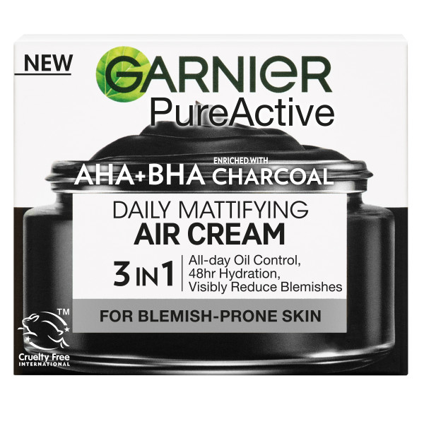 Skin Active Pure Active Mattifying Air Cream -kasvovoide sisältää niasiiniamidia + AHA + BHA. Koostumus sisältää hiiltä ja se hillitsee ihon kiiltoa koko päivän samalla kun se kosteuttaa ihoa 48 tuntia ja vähentää epäpuhtauksia. Ihosi näyttää puhtaalta ja näkyvästi tasaisemmalta. Välittömästi imeytyvä koostumus ei tuki ihohuokosia eikä jätä iholle tahmaista tunnetta tai näkyviä mustia tuotejäämiä.