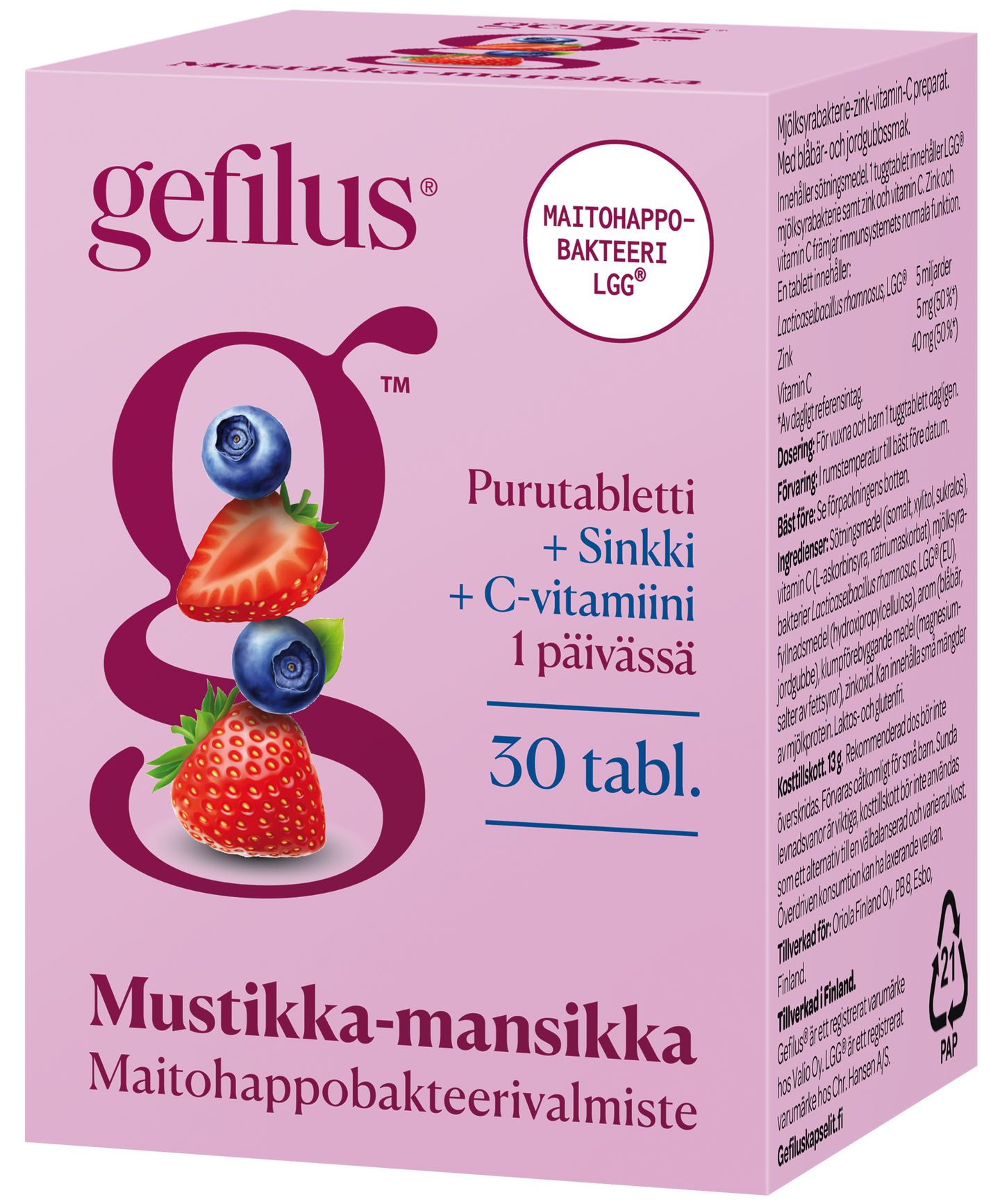 Gefilus mansikka-mustikka C+Sinkki maitohappobakteeri-vitamiinivalmiste purutabletti 30tabl ravintol