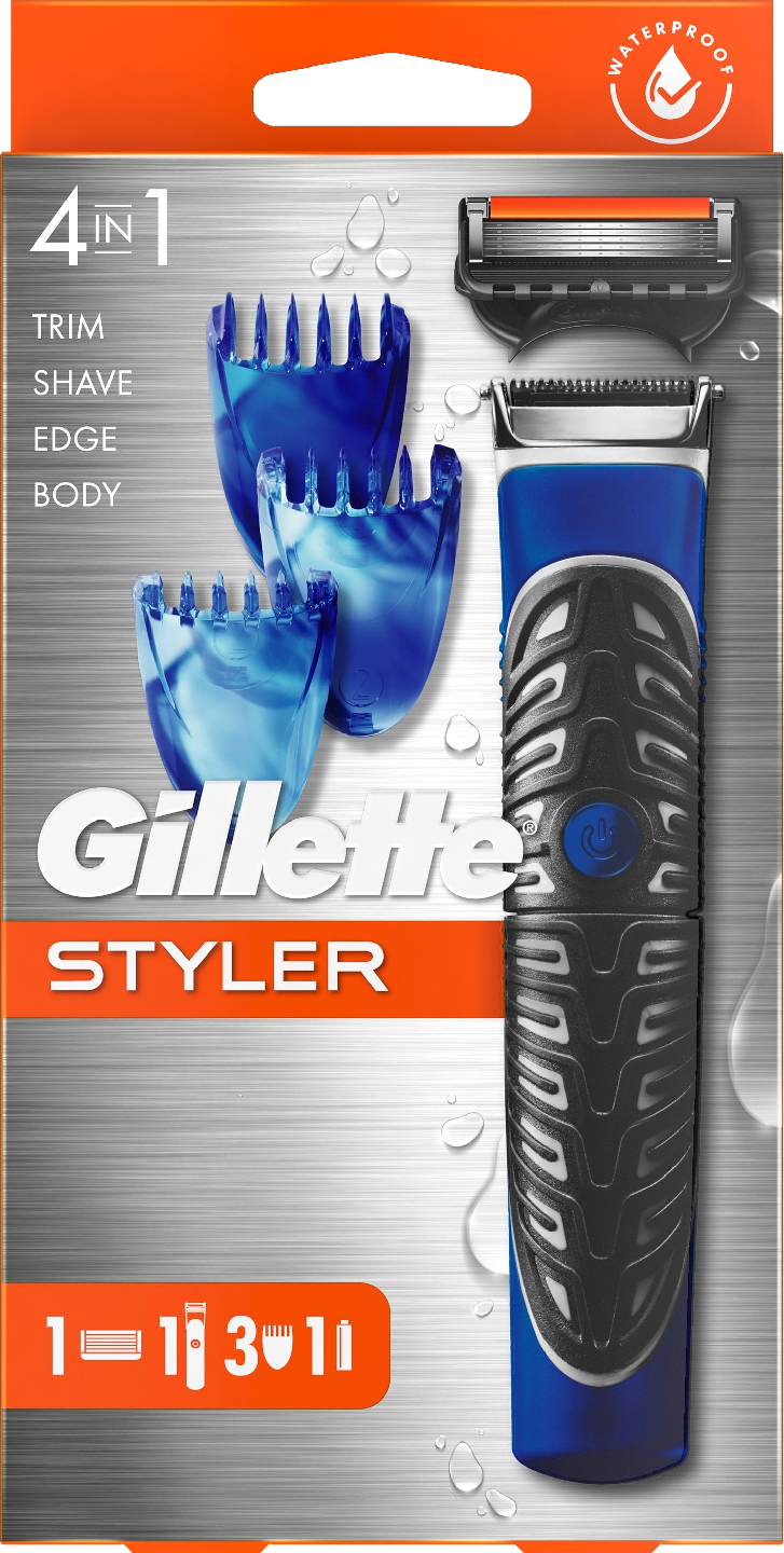 Gilletten 4in1 Styler trimmaa tasaisesti, ajaa tarkasti ja muotoilee terävät linjat. Se sopii erinomaisesti myös vartalon karvoituksen muotoiluun. Braun-tekniikkaa hyödyntävä Styler on vesitiivis, joten voit käyttää sitä myös suihkussa. All Purpose Stylerin avulla luot minkä hyvänsä partatyylin ja muotoilet vartalon karvoituksen kätevästi yhdellä tarkalla välineellä. Pakkaus sisältää trimmerin, yhden ProGlide-vaihtoterän, 3 kampaa (2 mm, 4 mm ja 6 mm) ja yhden pariston.