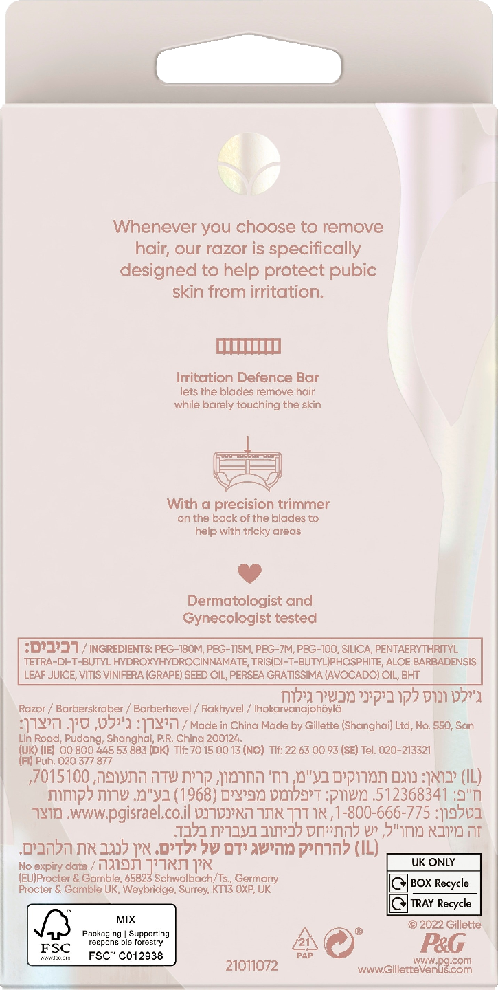 Intiimialueen karvoitukselle ja iholle tarkoitettu Gillette Venus Pubic Hair & Skin -höylä on suunniteltu erityisesti suojaamaan intiimialueen ihoa ajon aiheuttamalta ihoärsytykseltä. Patentodun Irritation Defense Bar -nauhan ja optimaalisesti sijoitettujen, Venuksen terävimpien terien ansiosta terät ajavat ihokarvat tuskin koskettaen ihoa. Höylän pieni pää ja terien kääntöpuolella oleva tarkkuustrimmeri auttaa ajamaan hankalat alueet ja sen ergonominen varsi kumimaisella pinnalla helpottaa hallintaa suihkussa. Saat loistavan tuloksen, kun käytät koko Venus for Pubic Hair & Skin -tuotevalikoimaa.
