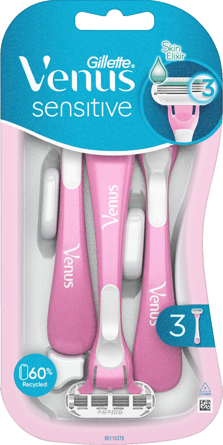 Venus Sensitive -varsiterät on suunniteltu herkkäihoisille naisille. Sen kolme vartaloa myötäilevää terää ja SkinElixir-voitelunauha antavat ihonmyötäisen ajon helposti ja mukavasti. Pehmeä, geelipintainen varsi sopii mukavasti käteen.