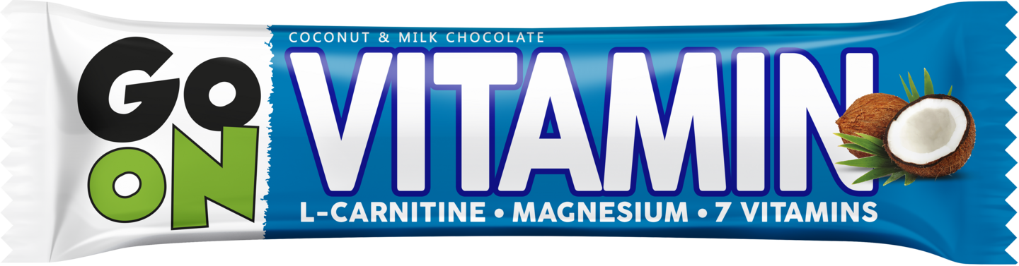 Go On vitamiinipatukka on päällystetty maitosuklaalla ja sisältää herkullisia kookoshiutaleita. Se on maukas kuin suklaapatukka ja soveltuu erinomaisesti urheilijoille ja aktiivisille ihmisille. Vitamiineilla, magnesiumilla ja L-karnitiinilla rikastettu patukka tarjoaa kaikki välttämättömät ravintoaineet fyysisesti aktiivisille ihmisille. Se on luotu kaikille, jotka rakastavat urheilua ja herkutteluhetkiä. Go On Vitamin on nopea välipala aktiivisille ihmisille ja se saapuu maaliviivalle erinomaisin tuloksin: