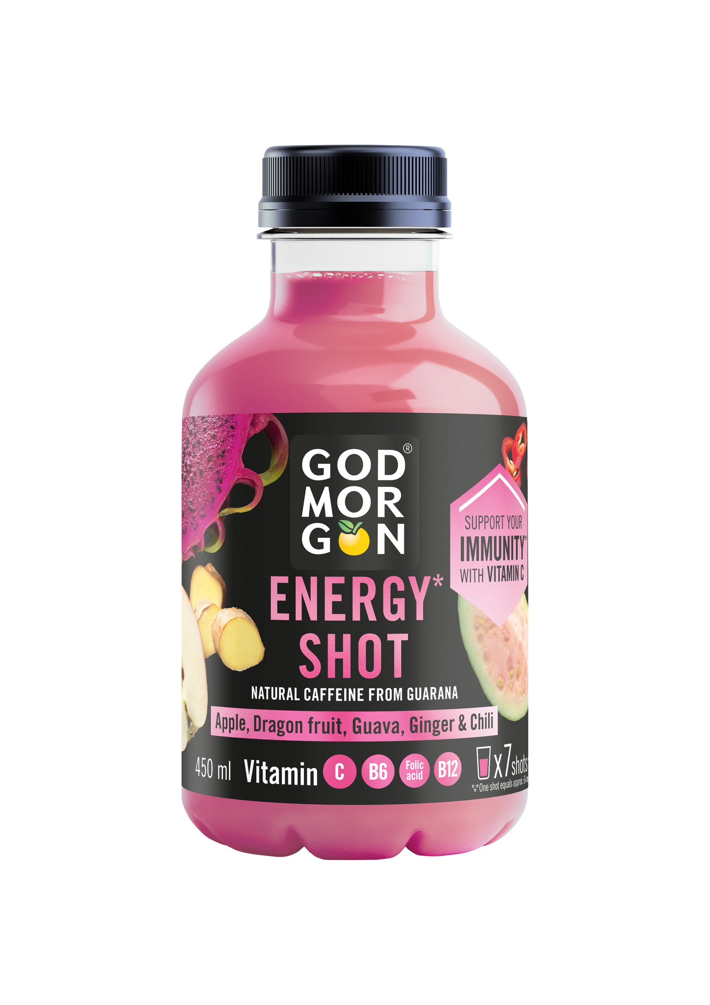 VegaaninenPinkki lohikäärmehedelmä antaa shotille intensiivisen värin ja maun. Shotissa lisäksi guavaa ja omenaa. Ripaus chiliä ja inkivääriä tuo energisoivan tunteen olematta maultaan kuitenkaan liian voimakas. Lisätty C, B6, B12 -vitamiineja ja foolihappoa. Sisältää kofeiinia guaranauutteesta.