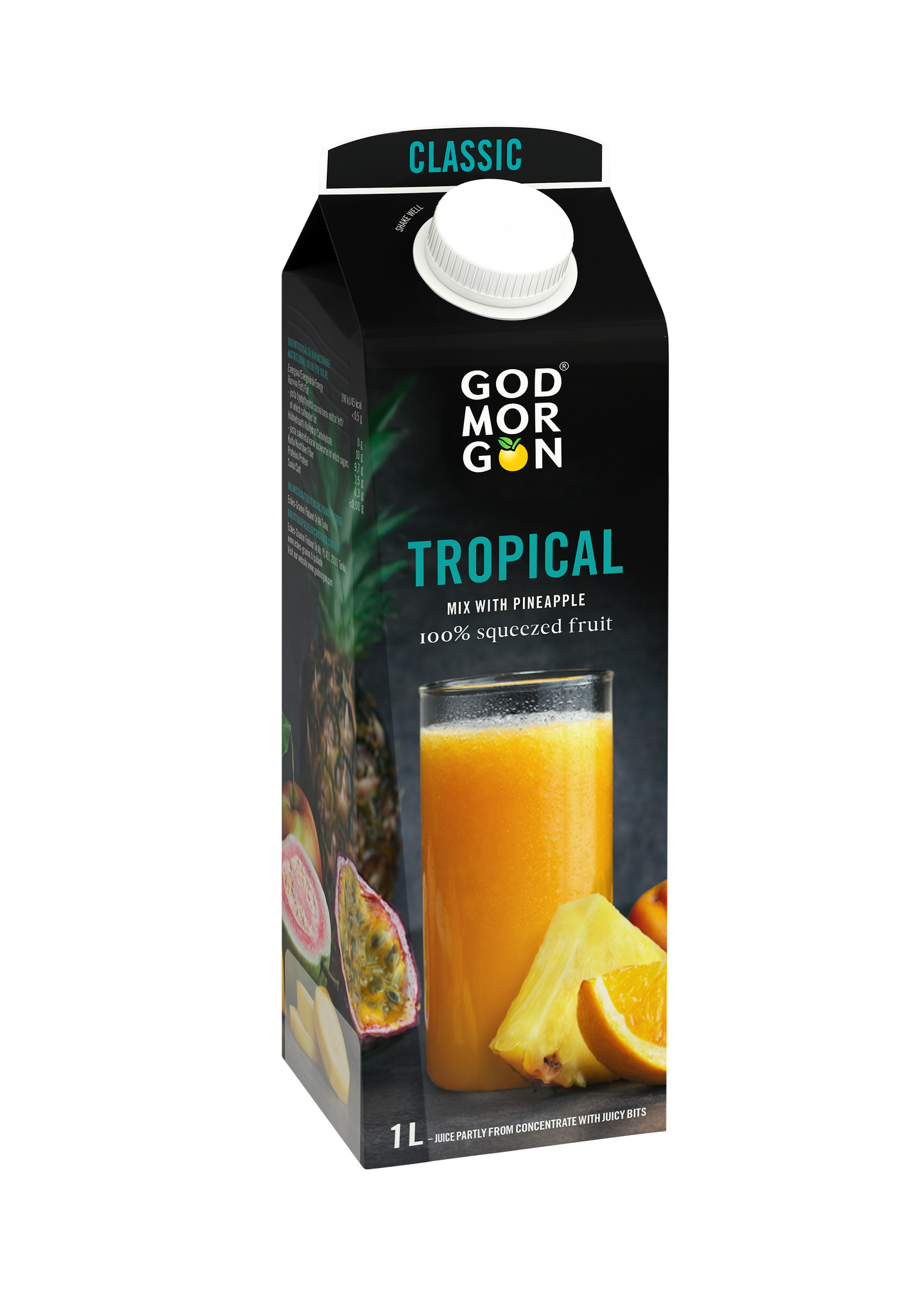 VegaaninenGod Morgon Classic Tropical täysmehu on maultaan ihanan pehmeä ja raikas sekoitus trooppisia hedelmiä.