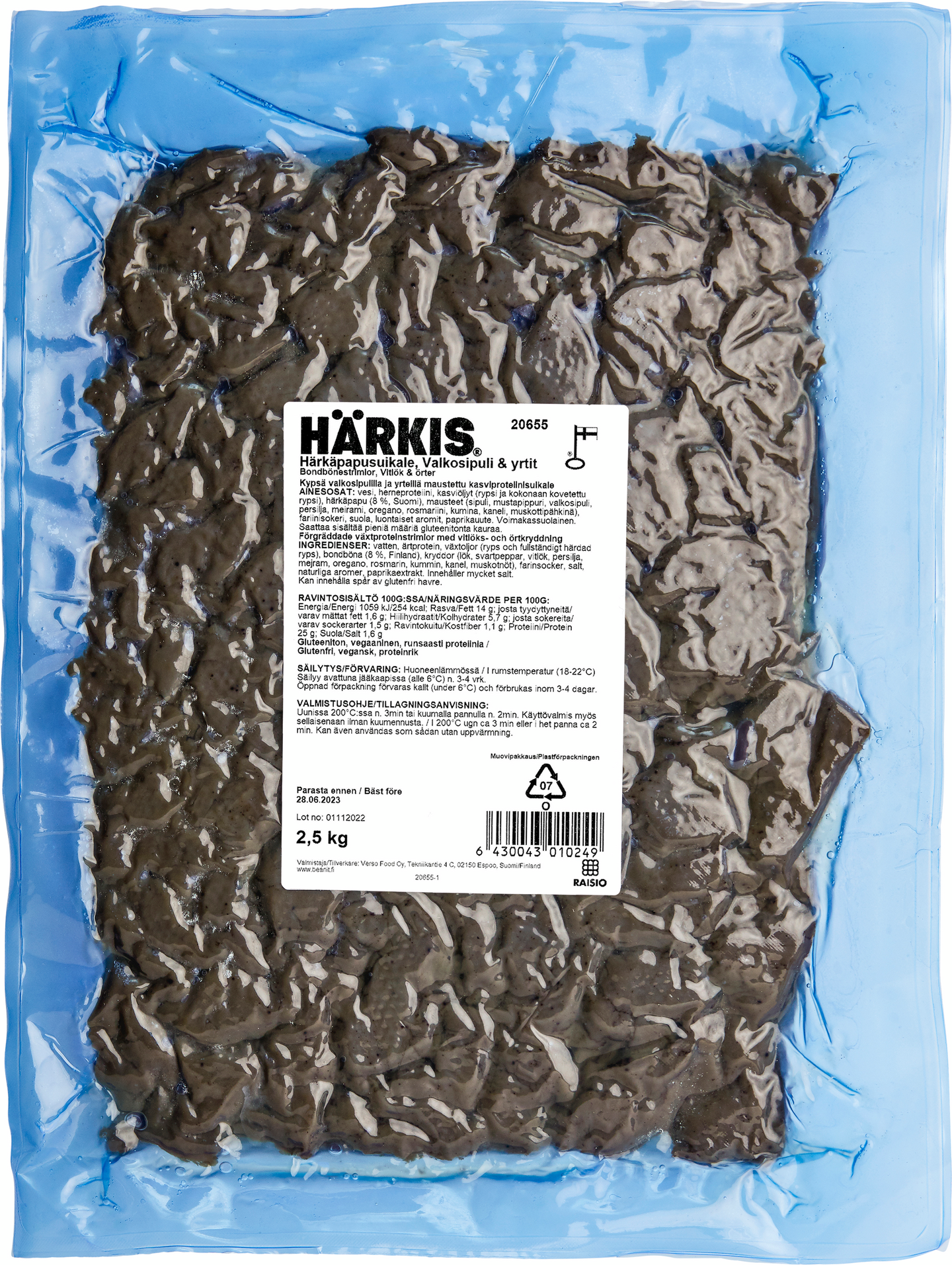 Vesi, herneproteiini, kasviöljyt (rypsi ja kokonaan kovetettu rypsi), härkäpapujauho 8 %, mausteet (sipuli, mustapippuri, valkosipuli, persilja, meirami, oregano, rosmariini, kumina, kaneli, muskottipähkinä), fariinisokeri, suola, aromit. Saattaa sisältää pieniä määriä gluteenitonta kauraa.