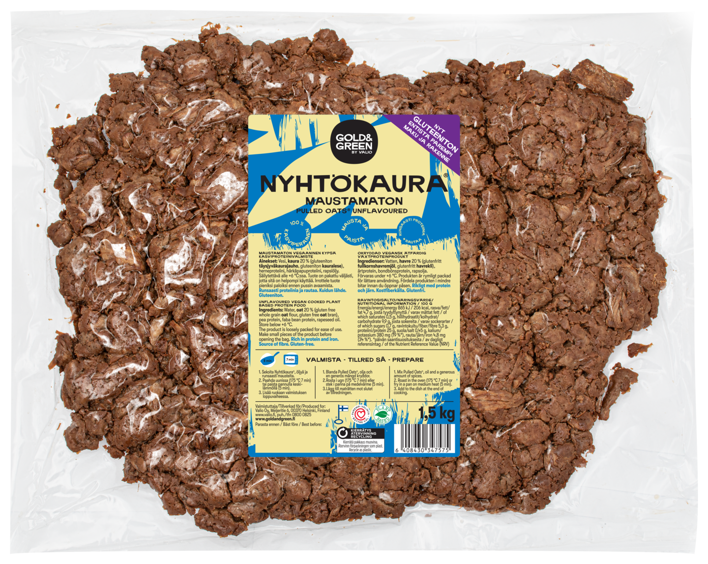 VegaaninenTäysin kasvipohjainen Gold&Green® Nyhtökaura® Maustamaton on gluteeniton ja vegaaninen kasviproteiini kaurasta ja palkokasveista monipuoliseen ammattikäyttöön. Se sopii jokaisen aterian sydämeen, kotiruokasuosikeista uusiin tuttavuuksiin. Kasvipohjainen ja gluteeniton Nyhtökaura sopii monen lautaselle. Nyhtökauran mehevä rakenne sitoo maut itseensä ja antaa tilaa luovuudelle keittiössä. Mausta mielesi mukaan! Pannulla Nyhtökaura paistuu rapeaksi ja imee itseensä makua. Nyhtökaura sisältää kuitua, ja roimasti proteiinia ja rautaa, ja sille on myönnetty Sydänmerkki. Muista myös maukas herkkuproteiini Delikaura® ja muut Gold&Green vegetuotteet!