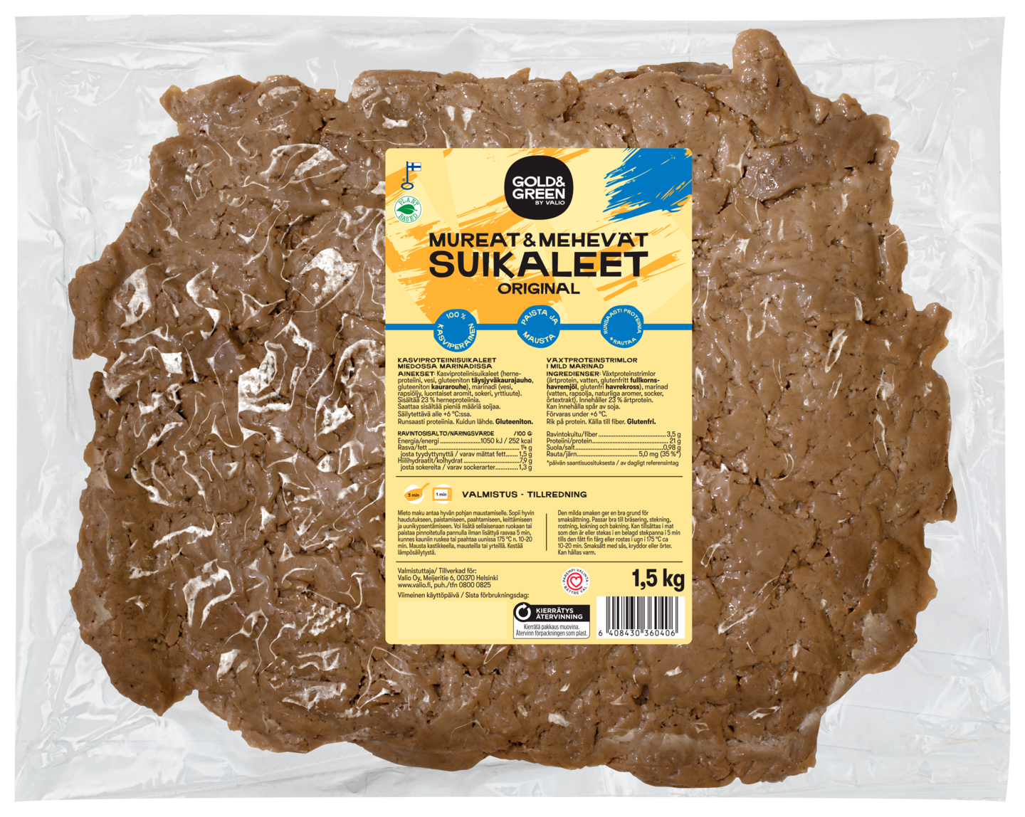 VegaaninenGold&Green® mureat ja mehevät Original-suikaleet ovat maukas kasvipohjainen proteiininlähde moneen ruokaan. Mureilla ja mehevillä suikaleilla valmistat tutut ruoat kasvipohjaisina helposti, herkullisesti ja nopeasti. Voit käyttää suikaleita kanasuikaleiden tapaan. Suikaleet sisältävät roimasti kasvivoimaa, proteiinia ja rautaa, joiden riittävä saanti on tärkeää jokaiselle, ei vain kasviperäistä ruokavaliota noudattaville. Herkulliseen ruoanlaittoon, hyvä maku sisältää myös mehukkuuden! Mieto Original-maku mukautuu moneen makumaailmaan. Suikaleet sopivat sekä vegaanista ruokavaliota noudattaville että sekasyöjän kasvisruokapäiviin.