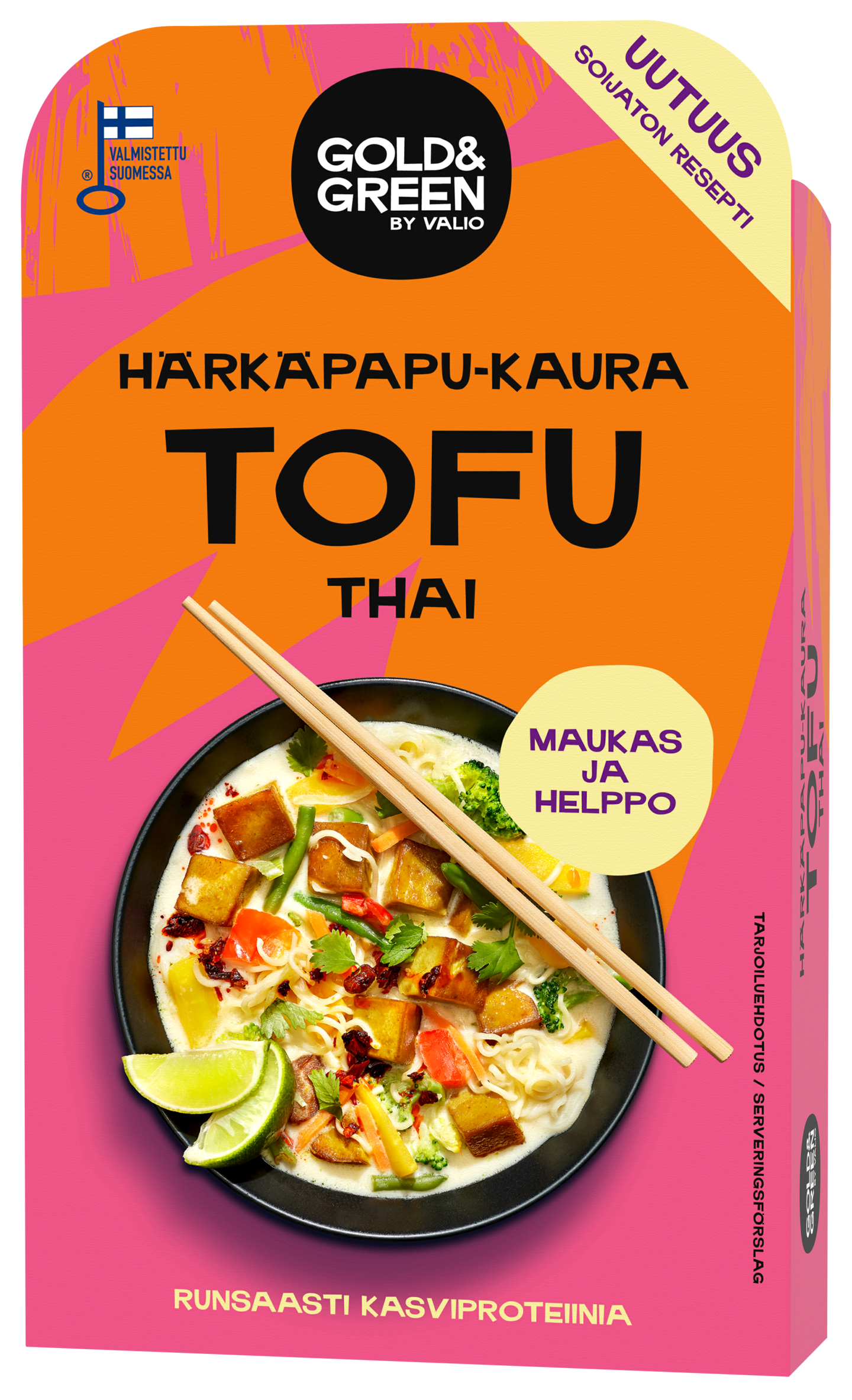 VegaaninenGold&Green® Härkäpapu-Kaura Tofu on uudenlainen tofu, joka valmistetaan härkäpavuista ja kaurasta. Se ei sisällä lainkaan soijaa, mutta kasviproteiinia löytyy reilusti, 14 g/100 g. Käyttöä helpottaa se, että Gold&Green® tofut ovat käyttövalmiita, eli niitä ei tarvitse prässätä tai kuivata ennen käyttöä toisin kuin monia muita tofuja. Sen kuin paloittelee pannulle tai airfryeriin ja lisää annokseen! Makua tofuista löytyy jo valmiiksi ilman marinointiakin. Thai-tofu on helppo oikotie aasialaiseen makumaailmaan. Mausteina on käytetty kurkumaa, korianteria, sarviapilaa, valkosipulia, kuminaa, fenkolia, musta- ja cayennepippuria, neilikkaa, tilliä, sitruunaruohoa, chiliä, ja kafferilimettiä. Suomessa valmistettu Avainlippu-tuote.