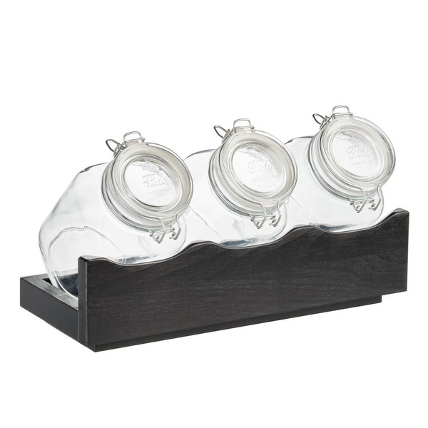 APS Good Morning -kokonaisuudella tehokas ja toimiva esillelaitto mysleille, hiutaleille ja muille kuiville ruoka-aineille. Tumma puinen teline, jossa 3 x 2l patenttikantista lasipurkkia. Lasipurkkeja voi käyttää myös erikseen esillelaitossa.