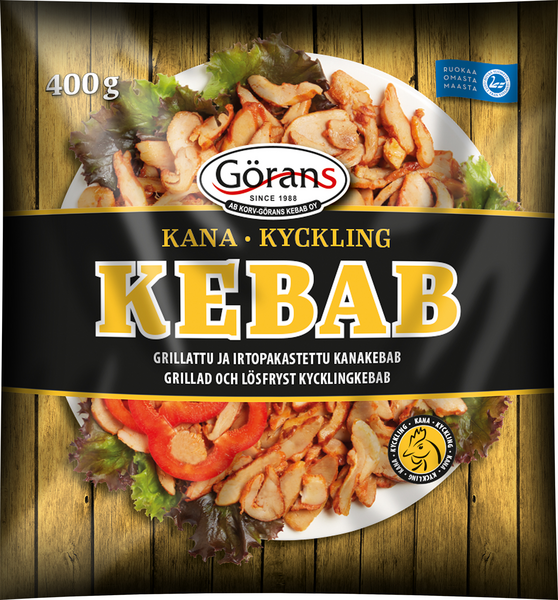 LaktoositonGörans kanakebab on valmistettu suomalaisesta broilerin reisipaistista. Tuote on kypsä ja irtopakastettu.