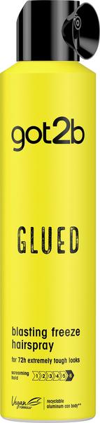 Käytä kuin suihketta, pitää kuin liima! got2b Glued Blasting Freeze Hairspray antaa sinulle huisten muotoilu, joka kestää jopa 72 tuntia – ilman tahmaista tunnetta tai hiusten kuivumista. Tämä got2b hiuslakka on täydellinen äärimmäisten tyylien kiinnittämiseen, jotka pysyvät paikallaan seuraavaan pesuun asti. Suihke on hellävarainen hiuspohjalle ja sopii kaikille hiustyypeille – todellinen unisex-suosikki hiusten muotoilua varten. Koostumus on lisäksi vegaaninen*. Näin käytät sitä: Täyden kiinnityksen saavuttamiseksi suihkuta tasaisesti hiuksiin noin 30 cm etäisyydeltä. Yksilöllisempää tyyliä varten suihkuta valikoidusti erillisiin hiusosiin. Hack: Yltiöpäisiin piikkeihin – aloita got2b Glued Water Resistant Spiking Gelillä kosteisiin hiuksiin, kierrä latvat ja suihkuta runsaasti kiinnittääksesi lopputuloksen. Anna kuivua ja viimeistele lisäsuihkeella. Älä unohda muotoilla kulmakarvojasi got2b Brows & Edges -tuotteella! Tuotteen edut lyhyesti: • Käytä kuin suihketta, pitää kuin liima! • Jopa 72h kestävä vahva pito • Ei tahmaista tunnetta tai kuivumista • Hellävarainen hiuspohjalle • Sopii kaikille hiustyypeille • Vegaaninen koostumus* • Saatavilla 300 ml / 100 ml Tietoa Gluedista: Glued toimii kaikille hiustyypeille – suorille, laineikkaille, kiharoille tai coily-hiuksille – ja toimii joka kerta. Se on hellävarainen sekä hiuspohjalle että iholle, ja dermatologisesti testattu, jotta voit luottaa hiusmuotoiluusi. *Ei sisällä eläinperäisiä ainesosia
