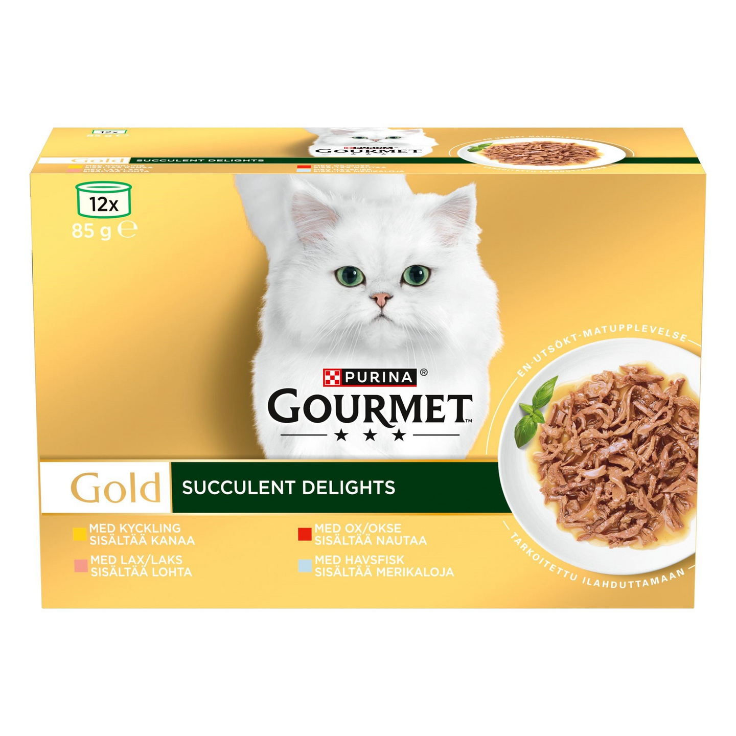 Aikuisen kissan täysravinto. GOURMET™ Gold on luonut Succulent Delights -tuoteryhmän: herkullinen tuote, joka on valmistettu mehukkaalla, hitaasti kypsytetyllä reseptillä ja sisältää meheviä paloja kissasi iloksi.