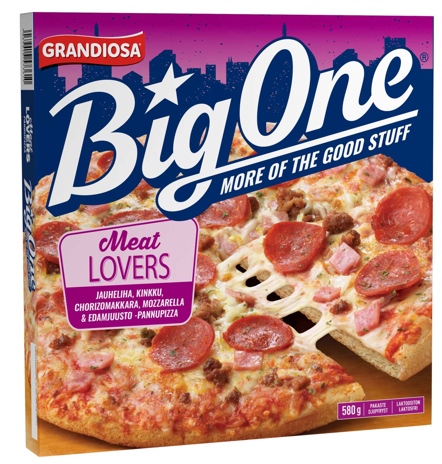 LaktoositonGrandiosa Big One® pakastepizza on amerikkalaistyylinen, mehevä, ruokaisa ja paksupohjainen pannupizza, joka sopii myös laktoosittomaan ruokavalioon. Big One Meat Lovers tarjoilee lihan, juuston ja pikanttien makkaroiden ystäville makunystyröitä kutkuttavan herkun: täyteläisen yhdistelmän mausteista chorizoa, korkealaatuista jauhelihaa, kinkkua sekä suussa sulavaa mozzarellaa ja edamjuustoa. Täytteiden hyvä maku ja mehevyys korostuvat laadukkaan pizzapohjan ansiosta: pohja on sisältä kuohkea ja alta mukavan rapsakka. Saat tämän herkun parhaat puolet esiin laittamalla pizzan jäisenä uuniin ja paistamalla sen 225 asteessa. Poista pakkaus ja lämmitä pizzaa uunipellillä uunin keskiosassa noin 14-17 minuuttia tai kunnes juusto on sulanut ja saanut kullankeltaisen värin. Todella rapean lopputuloksen saat paistamalla pizzan ritilän päällä. Big One pannupizzoissa on enemmän kokoa ja enemmän makua: More of the good stuff!