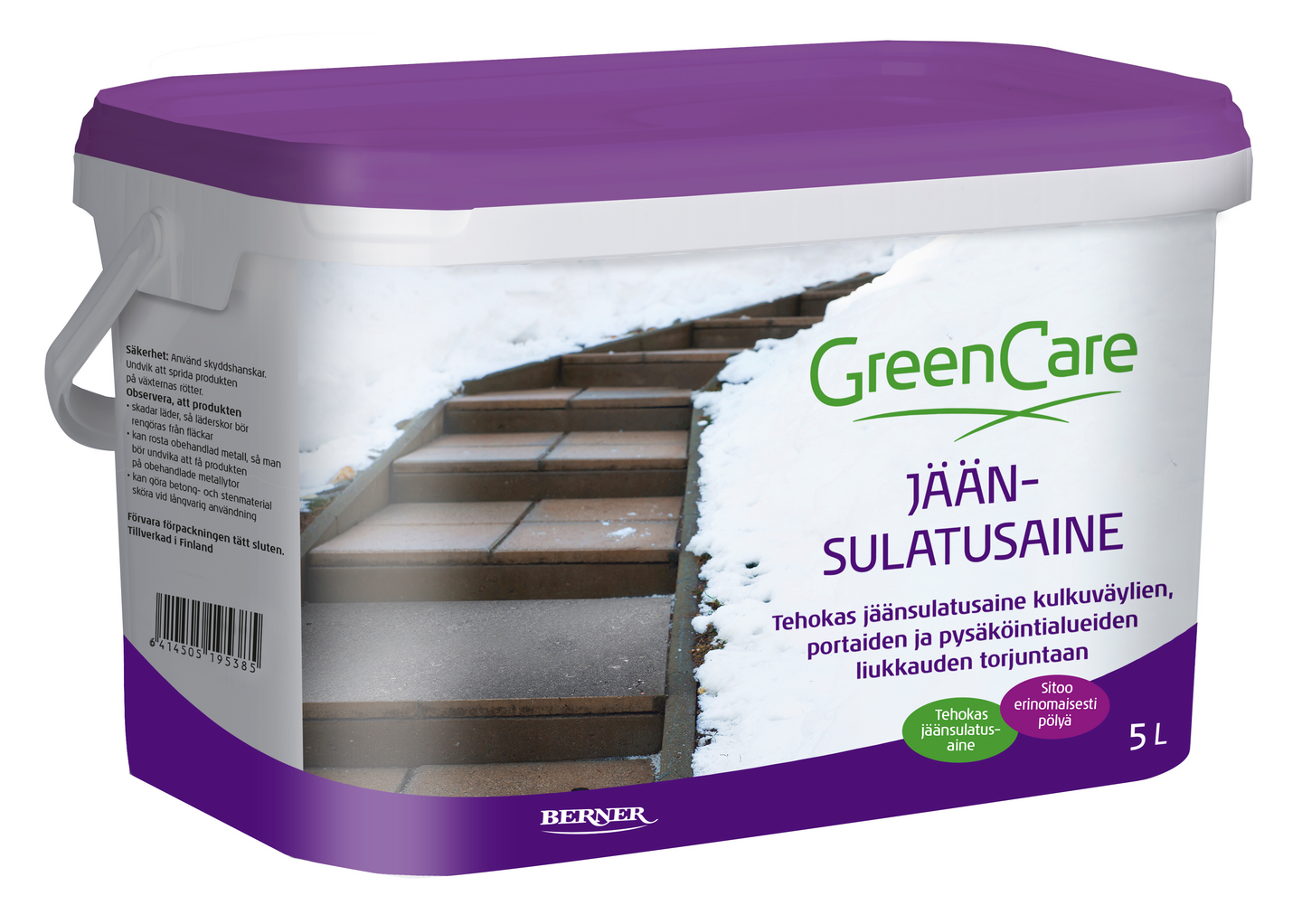 GreenCare Jäänsulatusaine sulattaa tehokkaasti ja nopeasti jäätyneet ja liukkaat alueet, kuten kulkuväylät, portaat ja pysäköintialueet. Tuote on rakenteeltaan hiutalemainen. Vaikuttava aine on magnesiumkloridi, joka on erittäin tehokas jäänsulatusaine ja toimii jopa -30 °C pakkasessa.