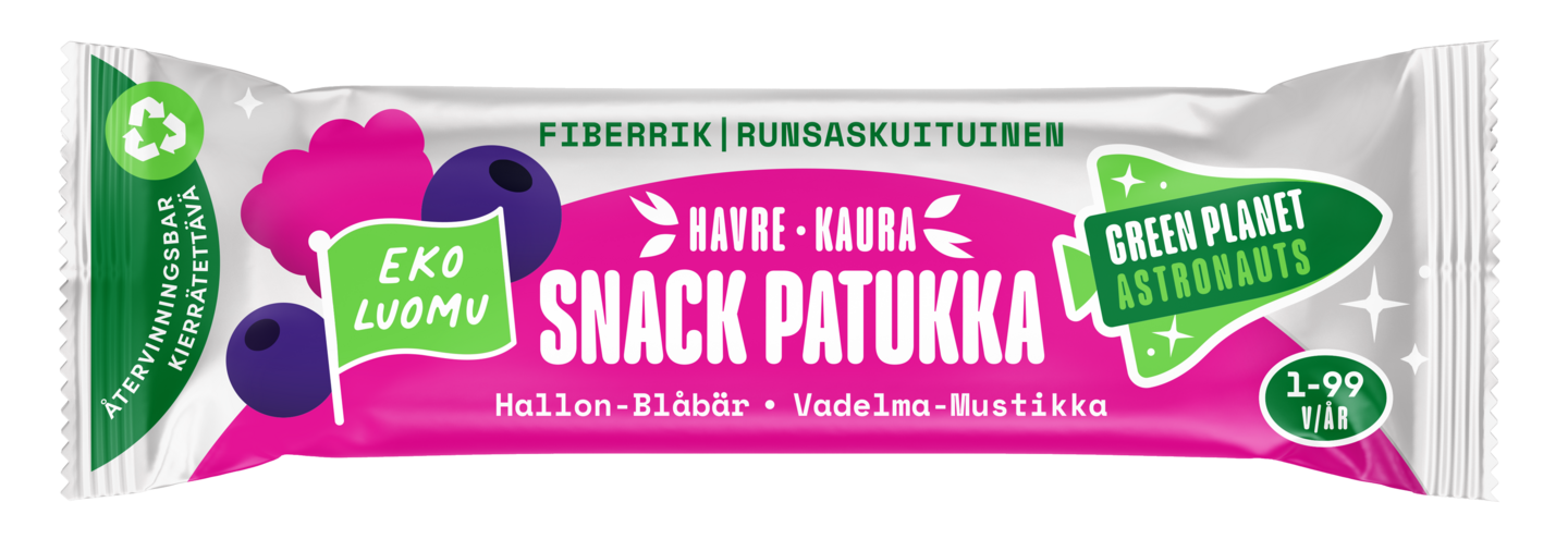 Runsaskuituinen ja ruokaisa vadelma-mustikka luomukaurapatukka on täydellinen välipala lapselle. Patukassa ei ole lisättyä sokeria, eikä mitään lisäaineita, herkullinen maku tulee marjoista ja hedelmistä. Agavekuitu tuo patukkaan luontaisesti runsaasti kuitua.