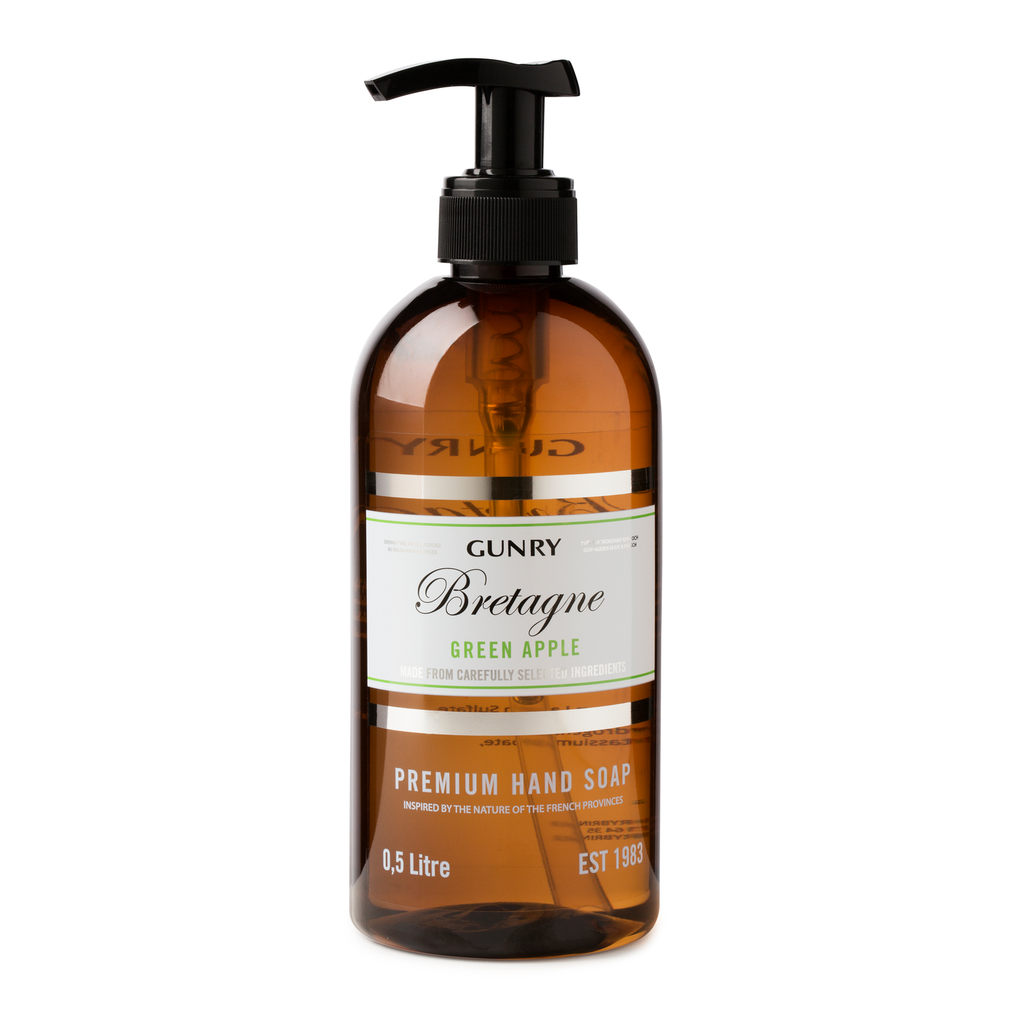 French Collection Gunrylta on sarja edullisia designkäsisaippuoita, joiden tuoksu on saanut inspiraatiota Ranskan maakunnista. Bretagnen tuoksu on saanut inspiraationsa vihreästä omenasta. Raikkaalla vihreän omenan vivahteella saat käsiisi raikkaan tuoksun. Käsisaippua sisältää 96 % luonnollista alkuperää olevia ainesosia, se puhdistaa kädet hellävaraisesti ja jättää niihin pehmeän tunteen. Se on myös vegaaninen eikä sisällä mikromuoveja. Tyylikäs, ruskea pullo tekee French Collection Bretagne Green Applesta mukavan osan kylpyhuoneen ja keittiön sisustusta. Tilavuus: 500 ml.