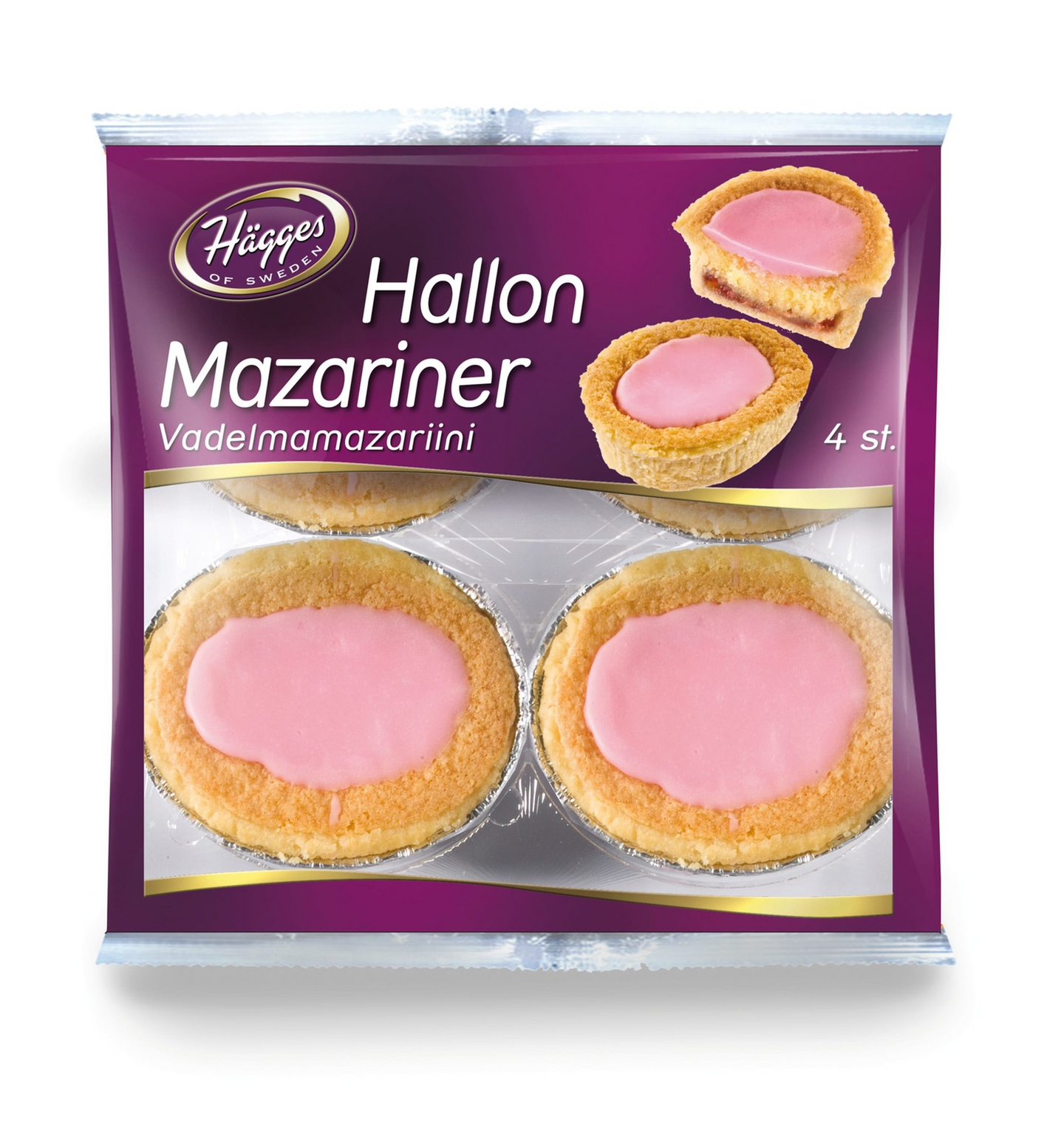 sokeri, margariini (kasvisrasva ja -öljy (palmu, rapsi, kookos), vesi, suola, aromi), VEHNÄJAUHO, vadelmatäyte 10% (sokeri, vesi, vadelma 10%, glukoosi-fruktoosisiirappi, tiivistetty vadelmamehu 1,5%, sakeuttamisaine (pektiini E509), happamuuden säätöaine (sitruunahappo E331), säilöntäaine E202, väriaine karamiini, tiivistetty seljankukkamehu, KANANMUNA, glukoosisiirappi, MANTELI, aprikoosinsiemen, kosteuden säilyttäjä glyseroli, KANANMUNAJAUHE, säilöntäaine (E262, E202), leivinjauhe (E450 bikarbonaatti), emulgointiaine E471, väriaine keramiini, aromi, sakeuttamisaine (johanneksenleipäpuujauhe, guarkumi).