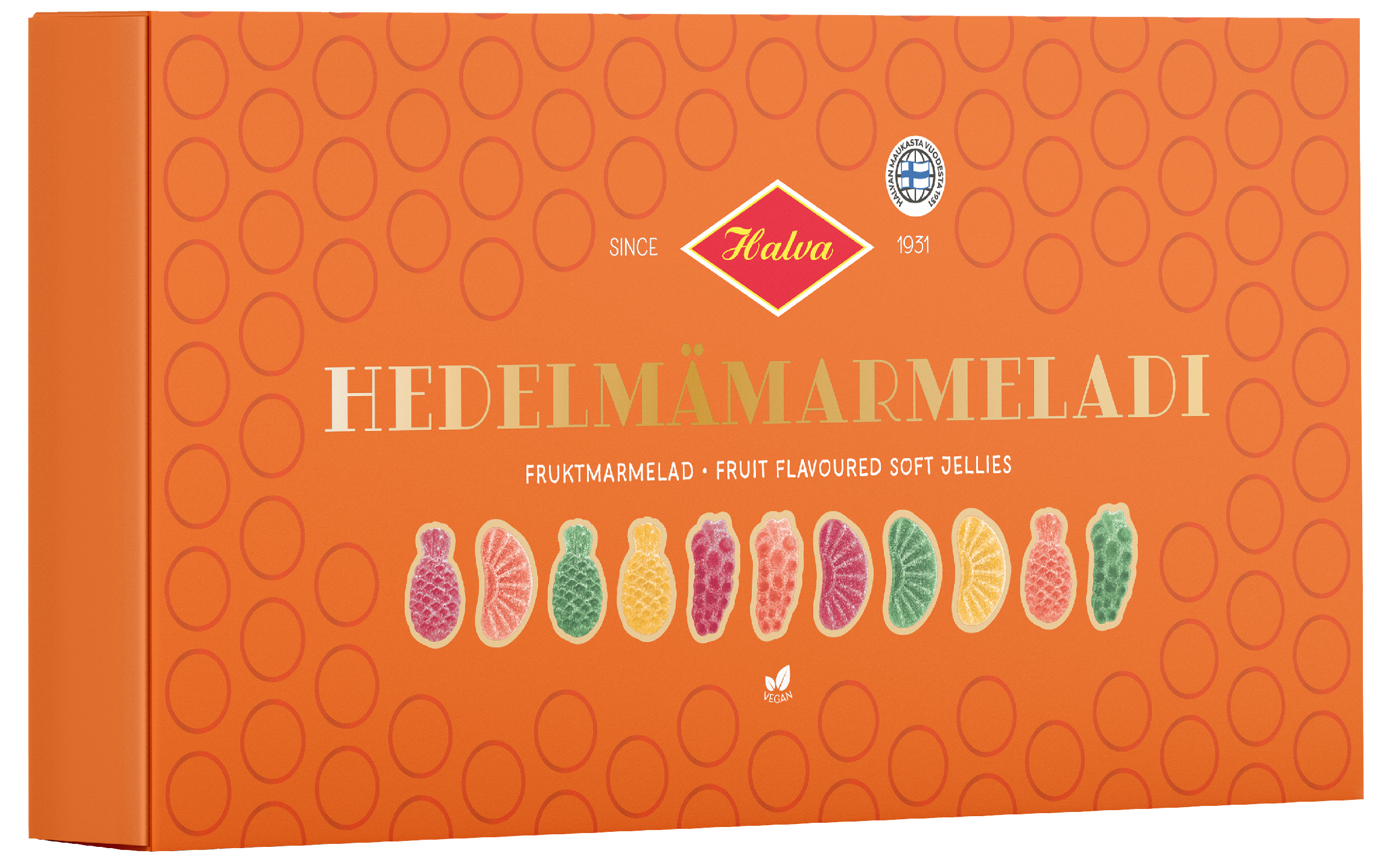 VegaaninenIso näyttävä rasia, makuina: appelsiini, metsämansikka, mustaherukka & päärynä. Tyylikkään rasian sisällä on 2 pussia, jotta marmeladit pysyvät pehmeinä ja tuoreina.