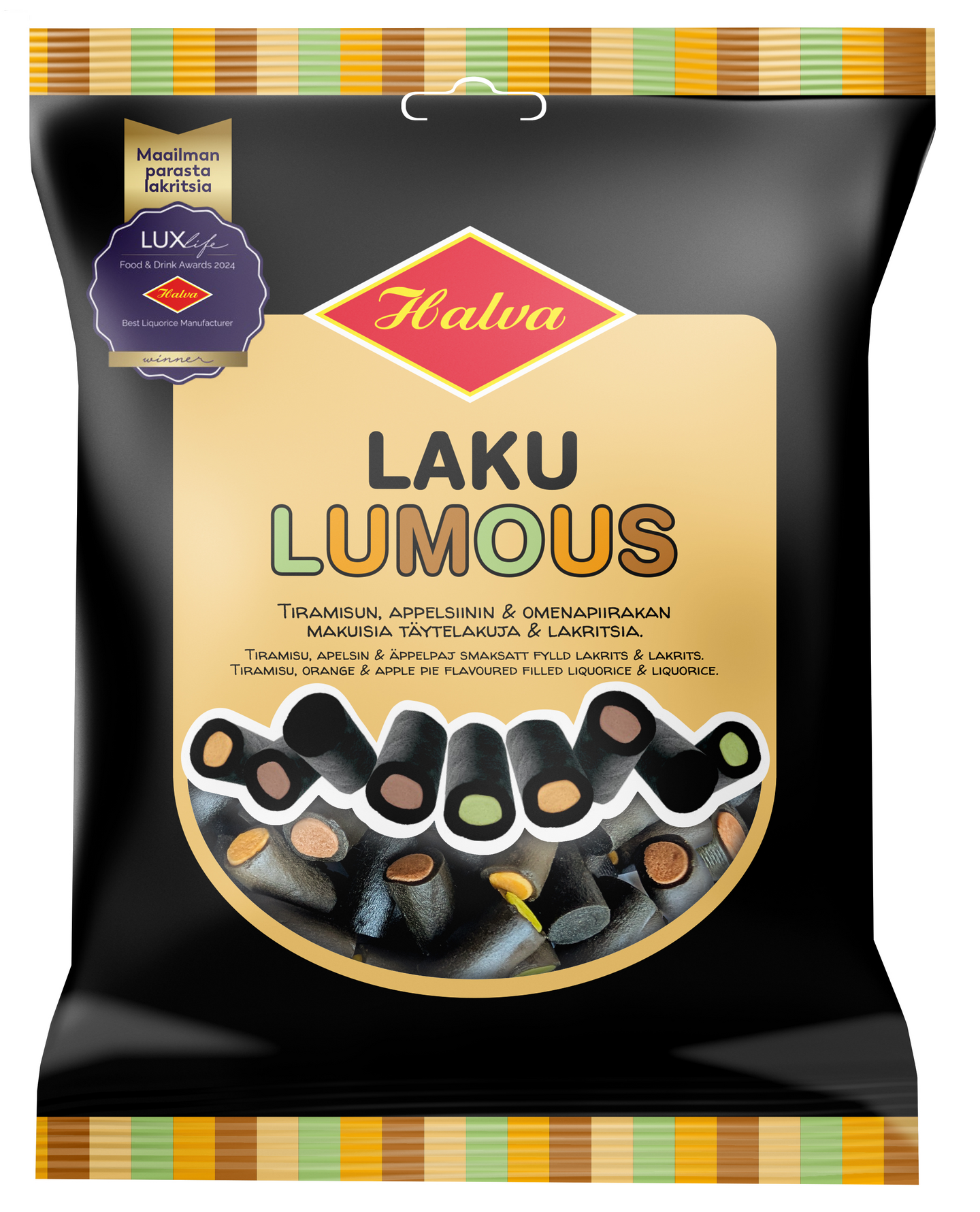 sokeri, sokerisiirappi, VEHNÄJAUHO, glukoosi-fruktoosisiirappi, glukoosisiirappi, lakritsiuute (alkuperä: muu kuin EU), liivate, kosteudensäilyttäjä (glyseroli), kokonaan kovetettu kasvirasva (kookos), värit (kasviperäinen lääkehiili, karmiinit, klorofylliinikuparikompleksit, karotenoidit), aromit, kaakaojauhe, suola, happamuudensäätöaine (sitruunahappo), säilöntäaine (kaliumsorbaatti), pintakäsittelyaine (karnaubavaha).