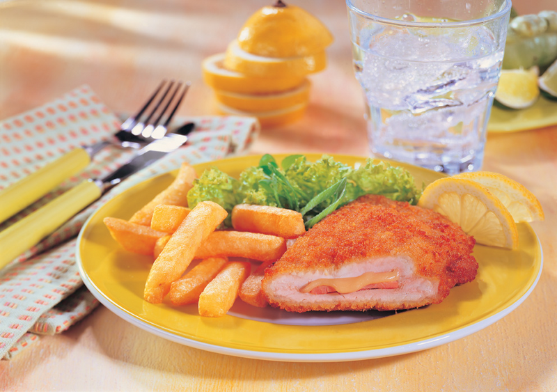 Porsaanliha (58%), paneeraus (VEHNÄjauho, muokattua maissitärkkelys, hiiva, suola, mausteet), kinkkuleike ((9 %)(porsaanliha, suola, dekstroosi, mausteet, stabilointiaine: trifosfaatti, antioksidantti: natriumaskorbaatti, säilöntäaine: natriumnitriitti), GOUDAJUUSTO (8%), rypsiöljy, vesi, suola, glukoosisiirappi, valkopippuri.