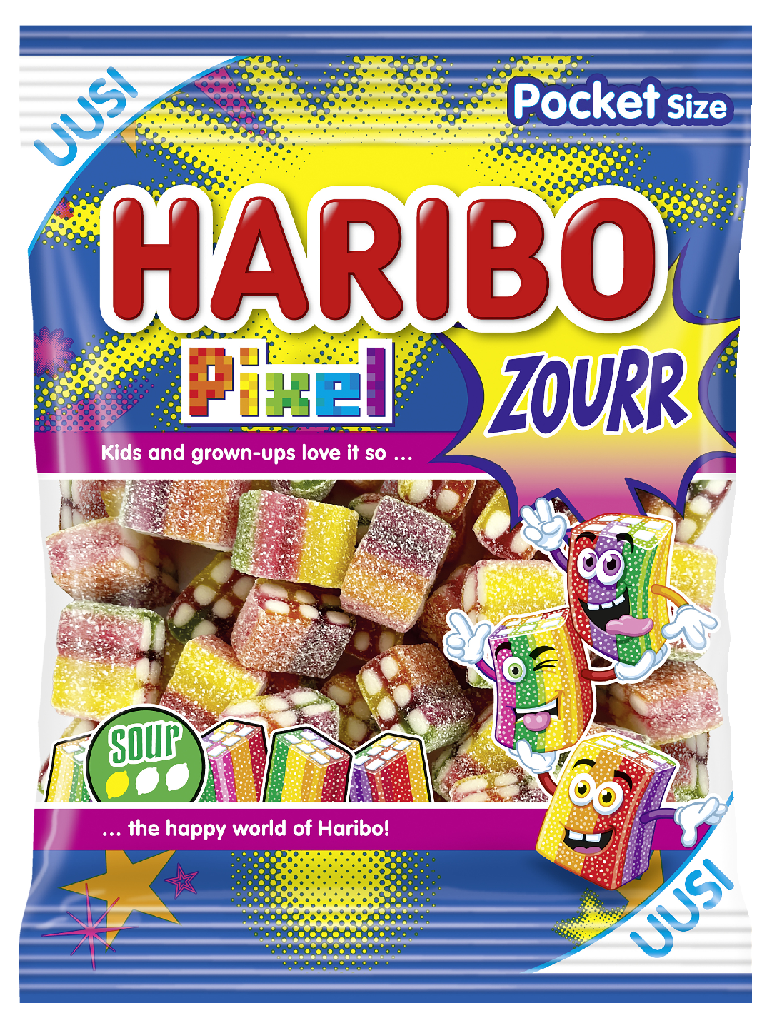 HARIBO Pixel Zourr -karkkipussin värikkäät pikselit ovat erityisen korkearesoluutioisia, varsinkin välipalan aikana! Pikselin trooppisilta hedelmiltä maistuva kuori kätkee sisäänsä herkullisen mansikkaisen sisuksen. Koko herkullisuus on kiedottu kirpeään sokerihuntuun ja sateenkaaren väreihin. Nämä pikselit voi syödä!