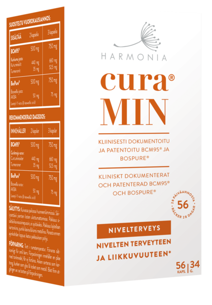 NIVELTEN TERVEYTEEN & LIIKKUVUUTEEN, IMMUUNIJÄRJESTELMÄN TOIMINTAAN, EHKÄISEMÄÄN HAPETUSSTRESSIÄ. curaMIN® sisältää hyvin dokumentoitua BCM95®:n (kurkumiini + turmeronit) & BosPure®:n (boswellia) yhdistelmää, jotka myötävaikuttavat toisiinsa ja siten vahvistavat toistensa ominaisuuksia. Teho & turvallisuus on osoitettu useissa tutkimuksissa. *Kurkuma (BCM95®) auttaa suojaamaan niveliä, tukemaan normaalia nivelten terveyttä, suojaamaan soluja hapettumisstressiä vastaan ja ylläpitämään immuunijärjestelmän normaalia toimintaa. Boswellia (BosPure®) tukee nivelten mukavuutta & liikkuvuutta.