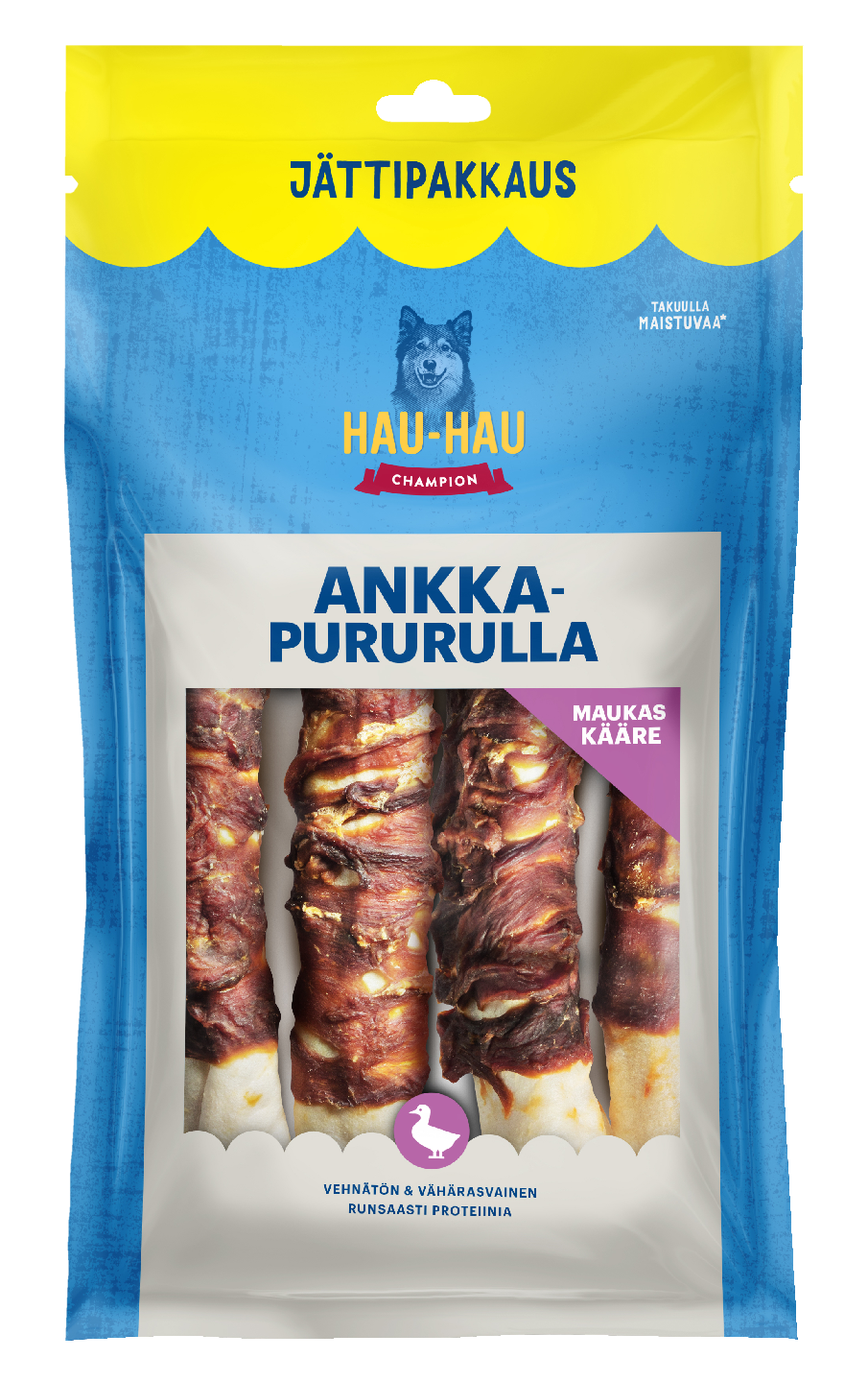Herkullinen Hau-Hau Champion Ankkapururulla on perinteinen puruluu, jonka ympärille on kieputettu nirsonkin koiran makunystyröitä hivelevä ankkafilee. Koiran aktivoinnin ohella tämä herkkuluu edistää suunterveyttä. Tätä rouskuvaa herkkuluuta on saatavilla kolmessa eri koossa.