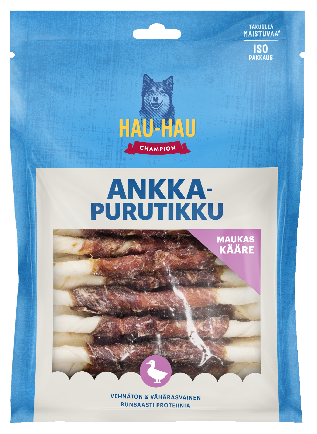 Mehevään ankkafileeseen kääritty Hau-Hau Champion Ankkapurutikku on maistuva koiran puruluu myös nirsoille koirakavereille. Naudanvuotatikun pureskeleminen edistää koiran suunterveyttä ja voi vähentää plakin muodostumista. Ankkapurutikku sopii etenkin pienten koirien ajanvietteeksi ja aktivointiin.