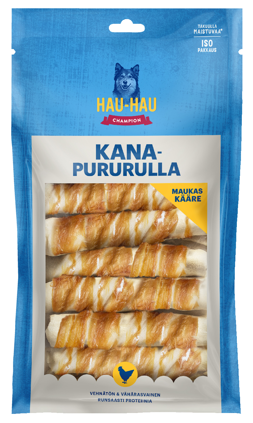 - Kanafileellä päällystetty puruluu - Runsaasti proteiinia - Hampaiden hyvinvointiin - Aktivointiin ja ajanvietteeksi - Valmistusmaa: Kiina Hau-Hau Champion Kanapururulla on klassikkopuruluu, joka maistuu herkullisen kanafileen ansiosta nirsollekin pureskelijalle. Aktivoinnin ohella tämä herkkuluu edistää koirasi suunterveyttä. Kolmesta kokovaihtoehdosta löytyy sopiva kaiken kokoisille koirille. Hau-Hau Championin lihaa sisältävät puruluut ovat kevyitä ja herkullisia virikeluita, jotka tarjoavat koirallesi sekä puuhakkaan hetken että mekaanista hampaidenpuhdista. Nirsokin koira herkuttelee mielellään fileillä kuorrutetuilla puruluilla. Puruluun kääreenä olevat kanafileet ovat kuivattua lihaa. Pidäthän siis huolen, että koirallasi on aina raikasta vettä saatavilla. Kanapururullat sisältävät runsaasti proteiinia, joten tarjoa niitä koiralle kohtuudella. Valvo aina koiraasi sen syödessä puruluita.