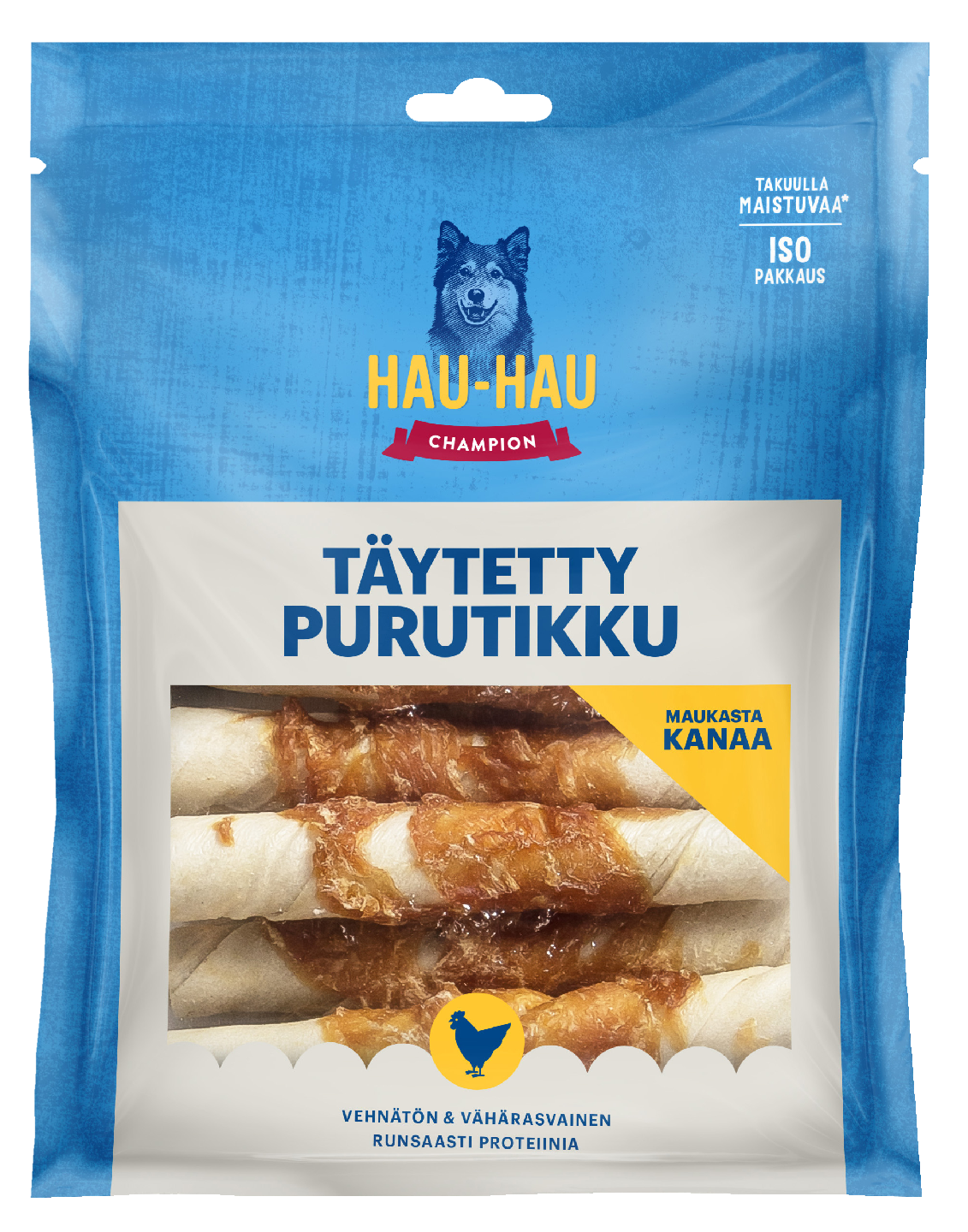 Hau-Hau Champion Täytetty purutikku on tuplasti herkullinen puruluu koirakaverillesi! Kanafileeseen käärityn naudannahkaluun sisällä on herkullinen kananmaksatäyte. Puruluiden pureskelu koiralle lajityypillistä tekemistä, joka myös auttaa pitämään huolta koirasi hampaista. Kaksi kokoa isoille ja pienille koirille.