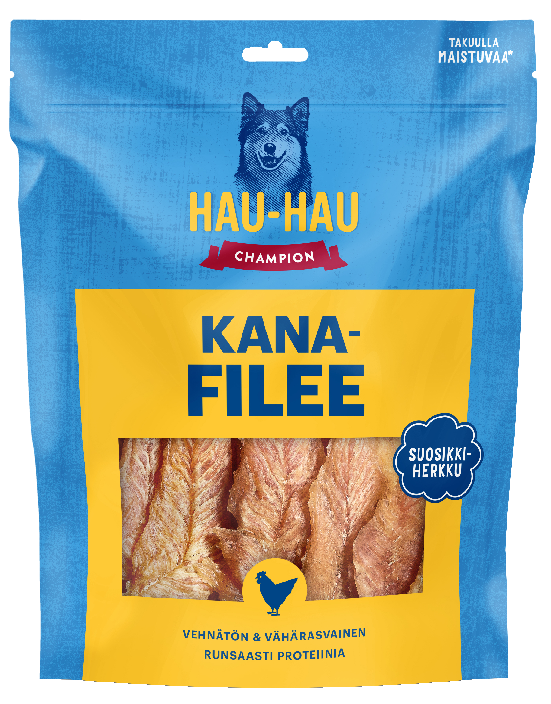 Herkullinen Hau-Hau Champion Kanafilee on hemmottelua joka puraisulla. Aidosta kananrinnasta valmistettu makupala on runsaasti proteiinia sisältävä mehevä herkku. Luontaisesti vähärasvainen kanafilee sopii myös helposti lihoville koirille.