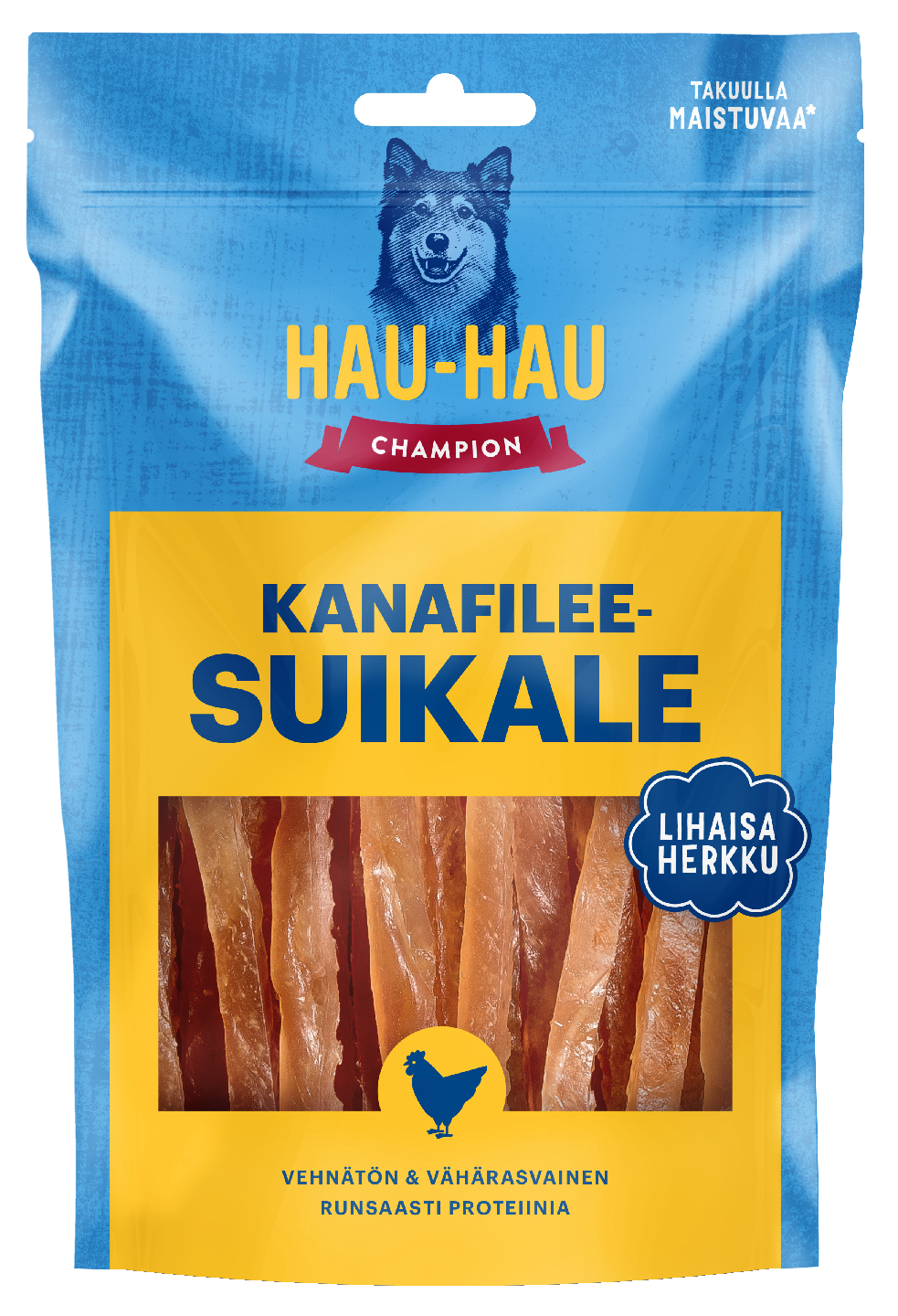 Hau-Hau Champion Kanafileesuikale on kevyt mutta maukas koiranherkku koulutustuokioihin ja pieniin herkutteluhetkiin. Mehevän lihaisa ja koostumukseltaan pehmeä suikale toimii erityisen hyvin pienten koirien palkkiona: taittele herkusta palasia ja palkitse koiraystäväsi vuolaasti kehuen!