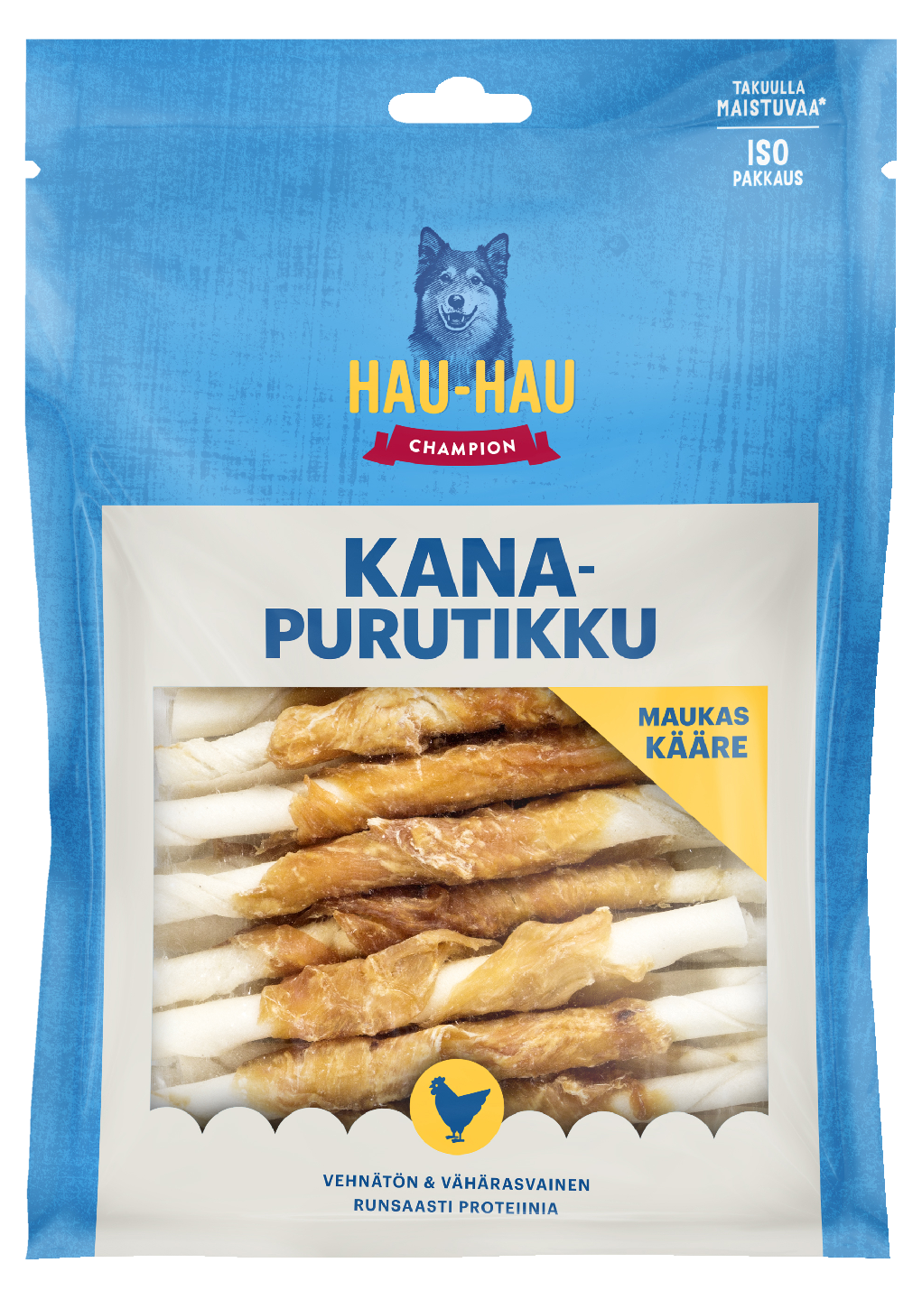 Hau-Hau Championin lihaa sisältävät puruluut ovat kevyitä ja herkullisia virikeluita, jotka tarjoavat koirallesi sekä puuhakkaan hetken että mekaanista hampaidenpuhdistusta. Fileillä kuorrutetut puruluut maistuvat nirsollekin koiralle. Purutikun kääreenä olevat kanafileet ovat kuivattua lihaa. Pidäthän siis huolen, että koirallasi on aina raikasta vettä saatavilla. Kanapurutikut sisältävät runsaasti proteiinia, joten tarjoa niitä koiralle kohtuudella. Valvo aina koiraasi sen syödessä puruluita.