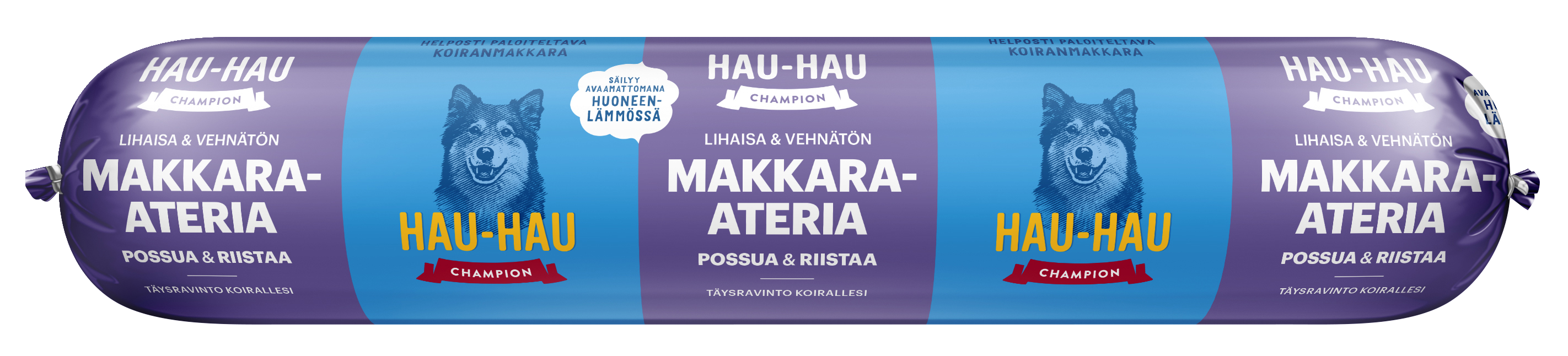 Hau-Hau Champion Makkara-ateria possua ja riistaa on vehnätön ja lihaisa täysravinto kaikille koirille. Huolella suunniteltu resepti sisältää kaikki koirasi tarvitsemat ravintoaineet. Muotonsa pitävä makkara sopii hyvin ateriaksi sellaisenaan, kuivaruoan lisukkeeksi tai makupaloiksi harrastuksiin. Koiranmakkara säilyy avaamattomana huoneenlämmössä, joten se on mukava ottaa mukaan matkalle tai metsäretkelle.