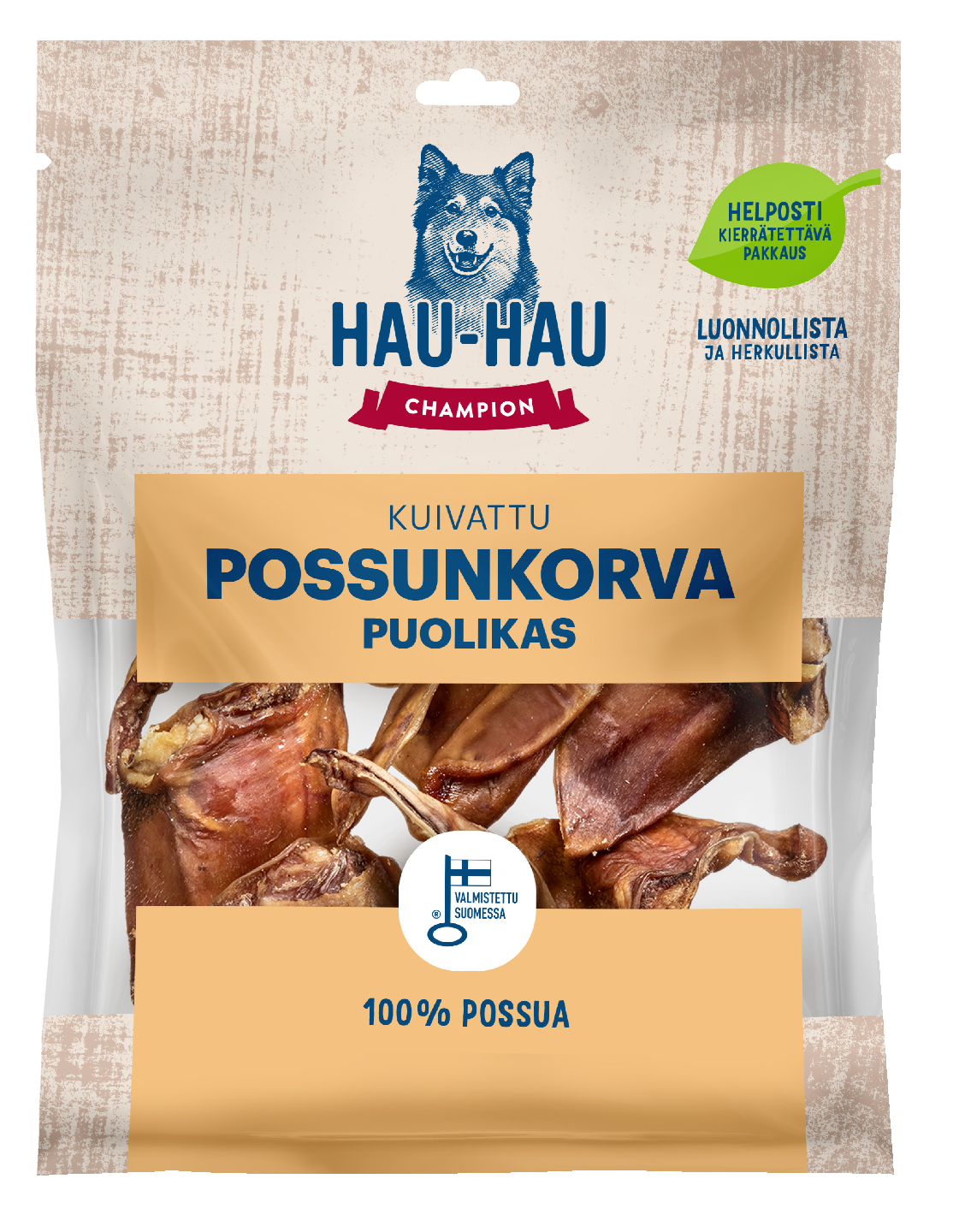 Joillekin koirille kokonainen possunkorva voi olla turhan suuri herkku kerralla syötäväksi, mutta puolikas possunkorva taas sitäkin oivallisempi valinta. Kotimainen Hau-Hau Champion puolikas kuivattu possunkorva on täysin lisäaineeton koiranherkku. Puolikkaat possunkorvat menevät tuoreena uuniin, jossa ne kuivatetaan ihanan rouskuviksi makupaloiksi. Tarjoa koirallesi puolikas possunkorva herkutteluun tai palkkioksi. Nämä koiranherkut valmistetaan Pirkanmaalla Ikaalisissa, ja niiden valmistuksessa hyödynnetään raaka-aineita elintarviketuotannon sivuvirrasta.