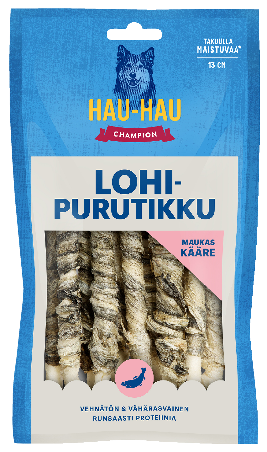 Ihanan kalaisa Hau-Hau Champion Lohipurutikku on maistuvaa puuhaa erityisesti pienille koirille. Naudanvuotainen purutikku on päällystetty rapean herkullisella lohennahalla. Puruluun pureskeleminen on myös hyväksi koirasi hampaille ja suunterveydelle.