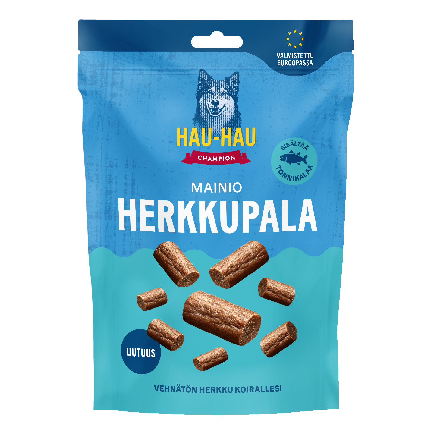 Hau-Hau Champion Mainio Herkkupala Tonnikalaa on suussa sulava klassikkoherkku koirallesi. Tonnikalan makuinen herkkupala on pilkottu pieneksi suupalaksi, joten se sopii sellaisenaan treeninamiksi. Vehnättömät herkkupalat sopivat hännänheiluttajasi sekä hemmotteluhetkiin että mukaan harrastuksiin. Mainiot herkut on valmistettu Euroopassa, ja ne ovat myös erinomaisia tuliaisia koirakavereille.