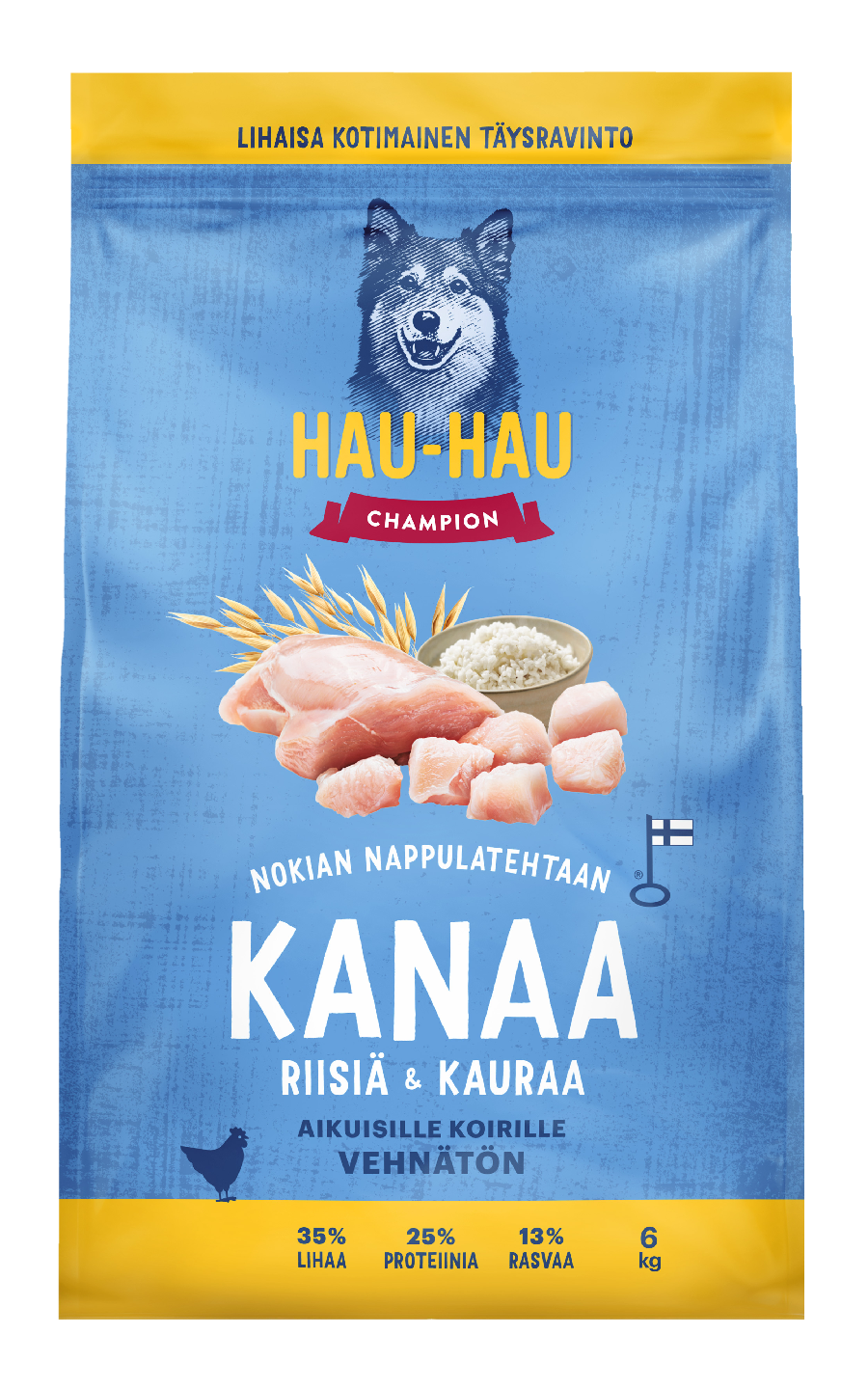 Hau-Hau Champion Nokian nappulatehtaan Kana-riisi-kaura täysravinto aikuisille koirille 6 kg