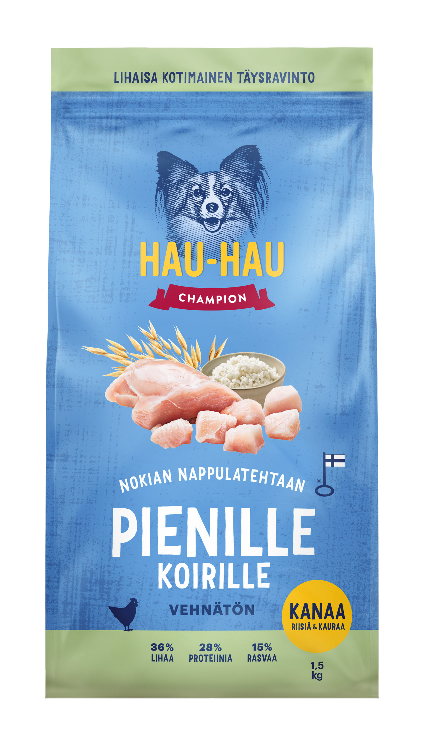 Hau-Hau Champion Nokian nappulatehtaan Kana-riisi-kaura täysravinto pienille aikuisille koiril 1,5kg