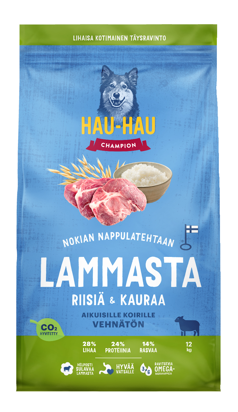 Hau-Hau Champion Lammasta, riisiä & kauraa on lihaisa, kotimainen koiran kuivaruoka. Vehnätön täysravinto sisältää 28 % lammasta ja kaikkiaan 24 % proteiinia, josta 70 % on eläinperäistä. Tämän koiranruoan ensisijainen proteiininlähde on helposti sulava lammas, joka sopii myös herkkävatsaisille koirille.
