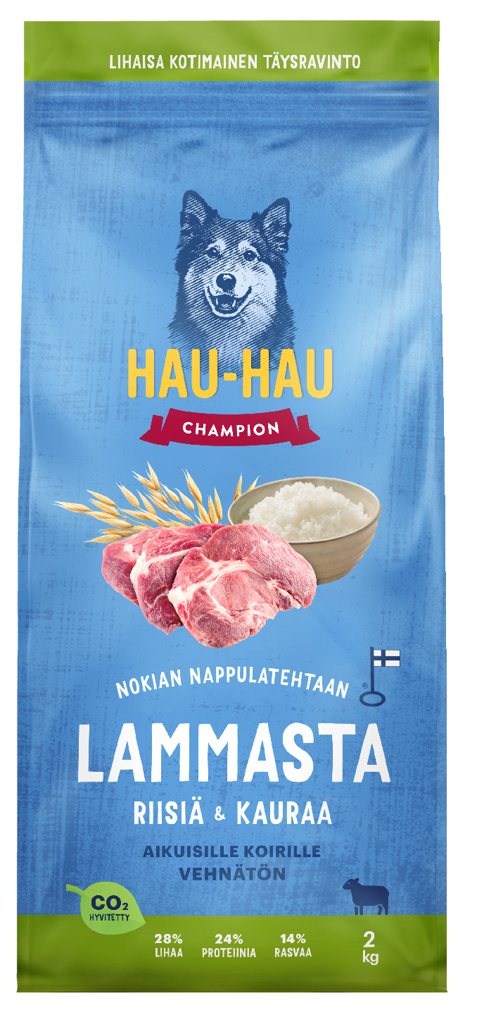 Hau-Hau Champion Nokian nappulatehtaan Lammas-riisi-kaura täysravinto aikuisille koirille 2kg