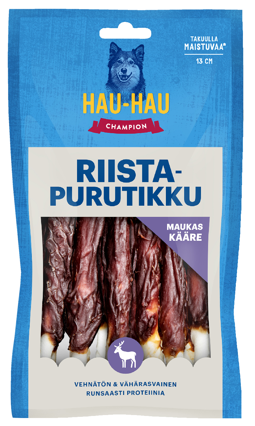 Hau-Hau Championin lihaa sisältävät puruluut ovat kevyitä ja herkullisia virikeluita, jotka tarjoavat koirallesi puuhakkaan hetken yhdistettynä mekaaniseen hampaidenpuhdistukseen. Fileillä kuorrutetut puruluut maistuvat nirsollekin koiralle. Purutikun kääreenä olevat peurafileet ovat kuivattua lihaa. Pidäthän siis huolen, että koirallasi on aina raikasta vettä saatavilla. Riistapurutikut sisältävät runsaasti proteiinia, joten tarjoa niitä koiralle kohtuudella. Valvothan aina koiraasi sen syödessä puruluita.