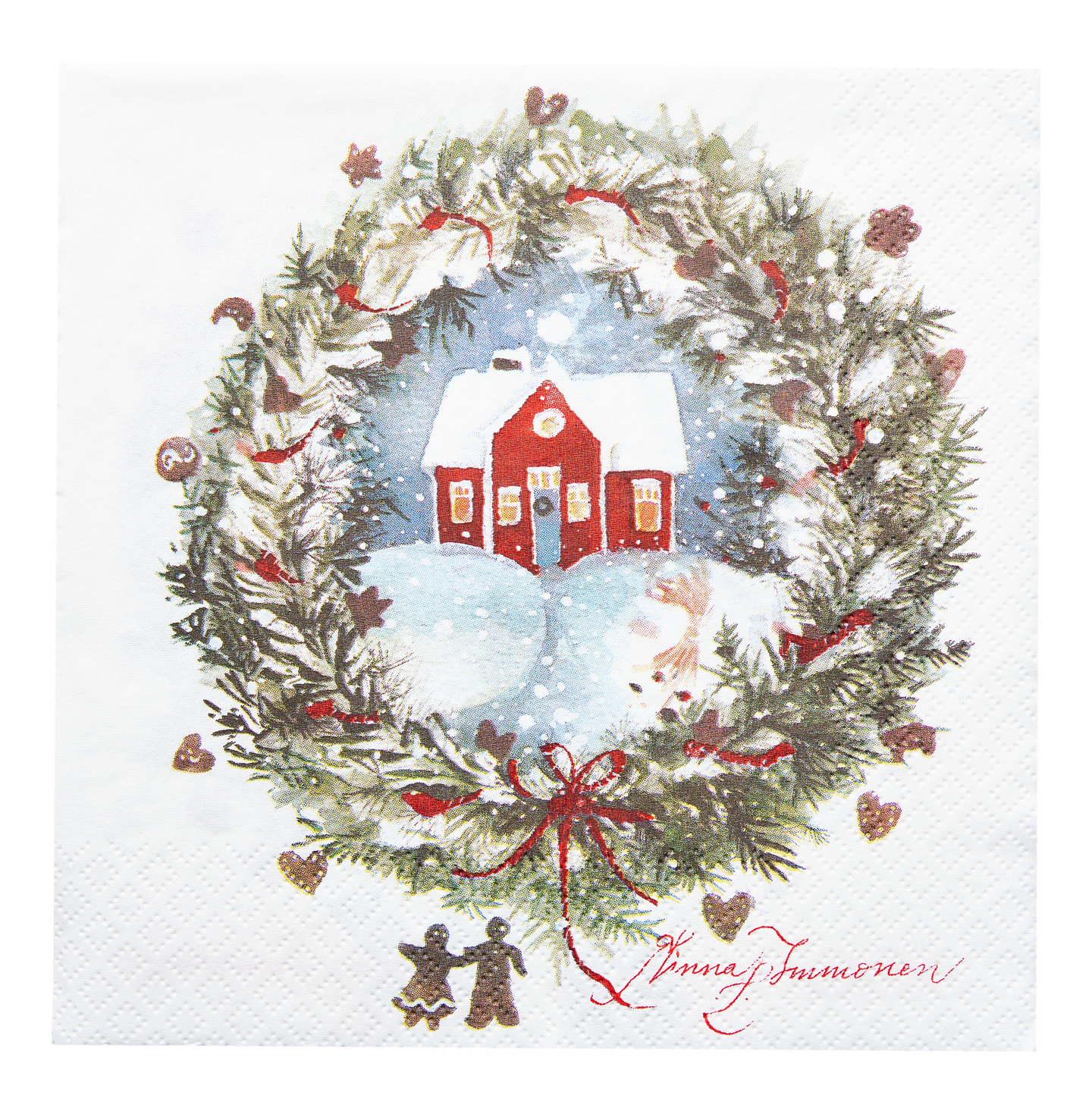 Havin valmistamat kotimaiset lautasliinat. Tunnelmallinen Talokranssi kuosi on Minna Immosen maalaama. Lautasliinat ovat painettu Imatralla 2-kertaiselle pehmopaperille ja niille on myönnetty Avainlippu.