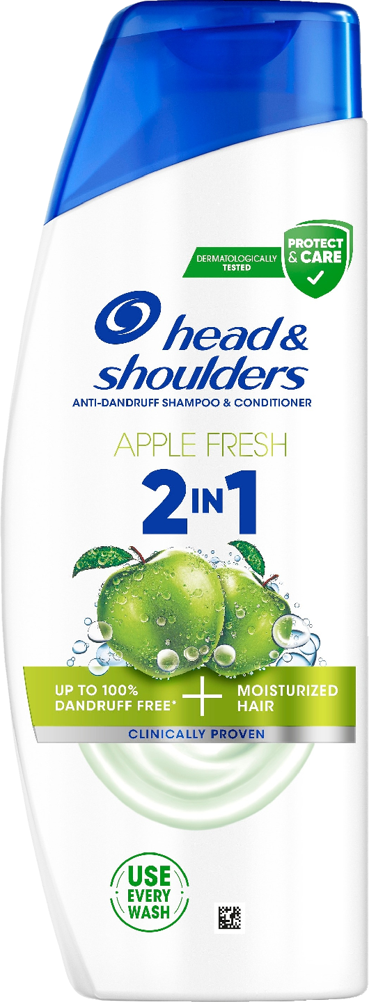 Head & Shoulders 2in1 Apple Fresh Hilseshampoo kaikille hiuksille & päänahoille, toimii jopa sitkeää hilsettä vastaan. Päivittäiskäyttöön sekä miehille että naisille tarkoitettu shampoo, jonka Microbiome Balance -koostumus iskee hilseen perimmäiseen syyhyn ylläpitäen tasapainoista päänahan mikrobiomia. Toimii sekä näkyvää että näkymätöntä hilsettä vastaan vapauttamalla 2x enemmän suojaavia ainesosia, jotka menevät huokosiin ja estävät lopulta pinttyneen hilseen palamisen. Tämän 2in1-sampoon koostumus sisältää 25 % enemmän hoitavia aineita kuin tavallinen Head & Shoulders -sampoo ja on kliinisesti todistettu, dermatologisesti testattu ja pH-tasapainoinen.
