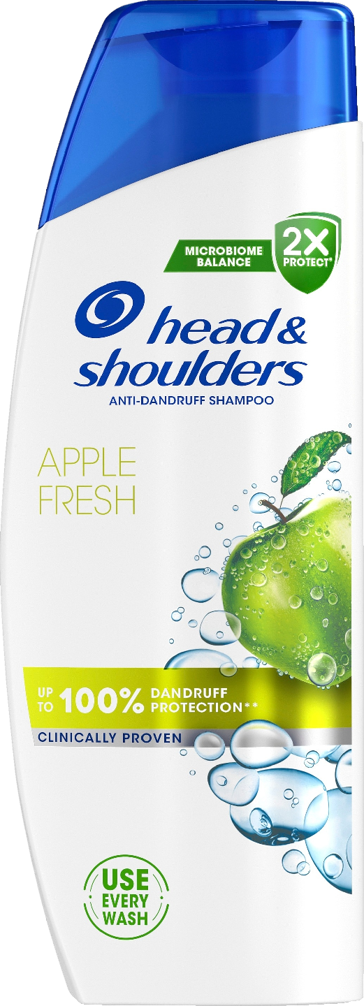 Head & Shoulders Apple Fresh Hilseshampoo xxxml kaikille hiuksille & päänahoille, toimii jopa sitkeää hilsettä vastaan. Päivittäiskäyttöön sekä miehille että naisille tarkoitettu shampoo, jossa on Raikas Omenan Tuoksu ja jonka Microbiome Balance -koostumus iskee hilseen perimmäiseen syyhyn ylläpitäen tasapainoista päänahan mikrobiomia. Toimii sekä näkyvää että näkymätöntä hilsettä vastaan vapauttamalla 2x enemmän suojaavia ainesosia, jotka menevät huokosiin ja estävät lopulta pinttyneen hilseen palamisen. Siinä on kliinisesti todistettu, dermatologisesti testattu ja pH-tasapainoinen koostumus, joka jättää päänahan ja hiukset puhtaiksi ja raikkaiksi.