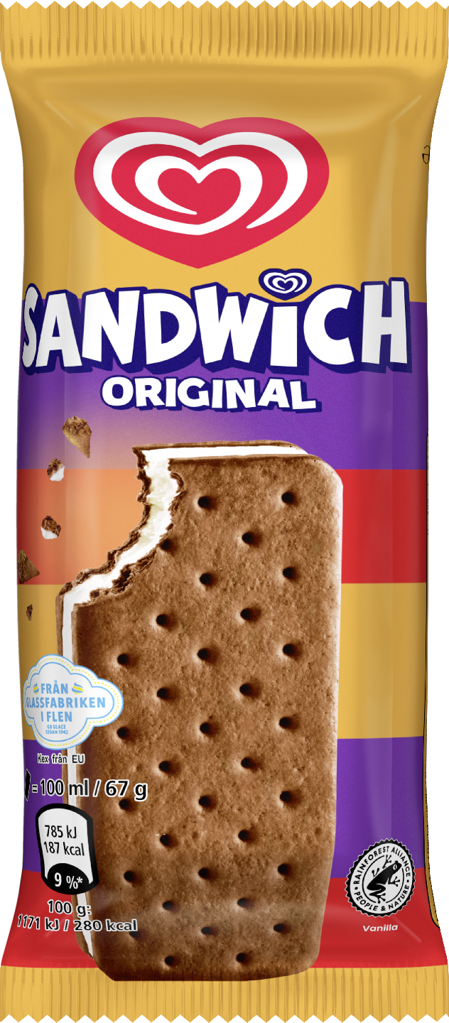 Sandwich Original on klassinen vaniljajäätelö kahden herkullisen suklaakeksin väliin käärittynä. Sandwich Original -jäätelö sopii erinomaisesti niin välipala- kuin herkutteluhetkiin, joten nauti tästä herkullisesta jäätelöstä yksin tai yhdessä!