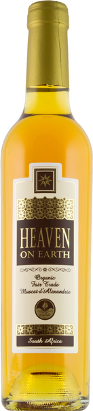 VegaaninenTähän viiniin käytettävät Muscat d´Alexandrie rypäleet ovat kuivuneen Etelä-Afrikan auringossa Rooibos teelehtien päällä. Tällä tavoin rypäleistä haihtuu nestettä ja jäljelle jää tiivistynyt, makea ja aromikas rypälemehu, joka käytetään viiniksi. Makeudestaan huolimatta viini ei tunnu raskaalta, koska tasapainoinen hapokkuus raikastaa jälkimakua. Heaven on Earth on luomuviini, joka on tuotettu reilun kaupan periaatteita noudattaen ja se soveltuu myös vegaaneille.